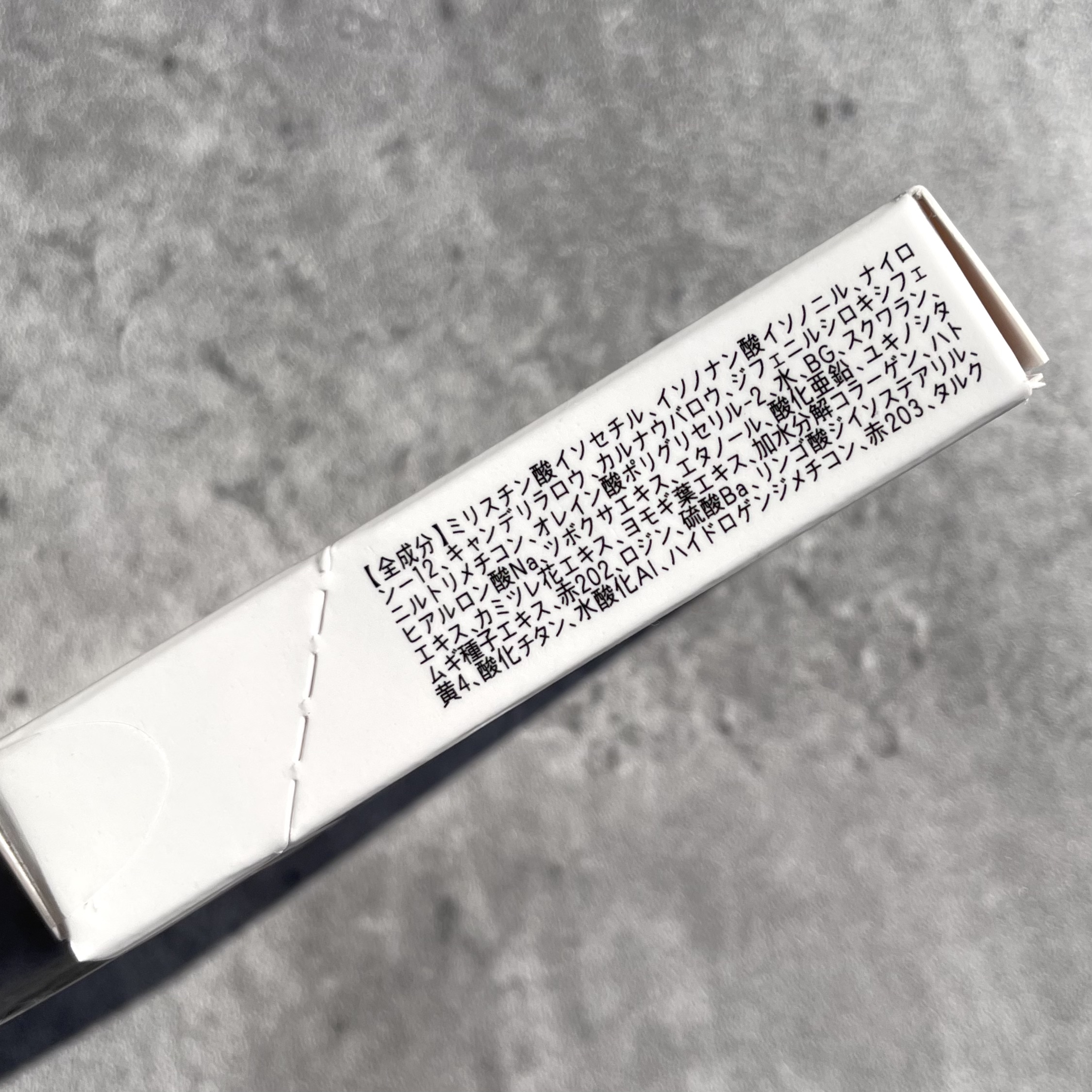 - ミリスチン酸イソセチル、イソノナン酸イソノニル、ナイロンー12、キャンデリラロウ、カルナウバロウ、ジフェニルシロキシフェニルトリメチコン、オレイン酸ポリグリセリル-2、水、BG、スクワラン、ヒアルロン酸Na、ツボクサエキス、エタノール、酸化亜鉛、ユキノシタエキス、カミツレ花エキス、ヨモギ葉エキス、加水分解コラーゲン、ハトムギ種子エキス、赤202、ロジン、硫酸Ba、リンゴ酸ジイソステアリル、黄4、酸化チタン、水酸化Al、ハイドロゲンジメチコン、赤203、タルク