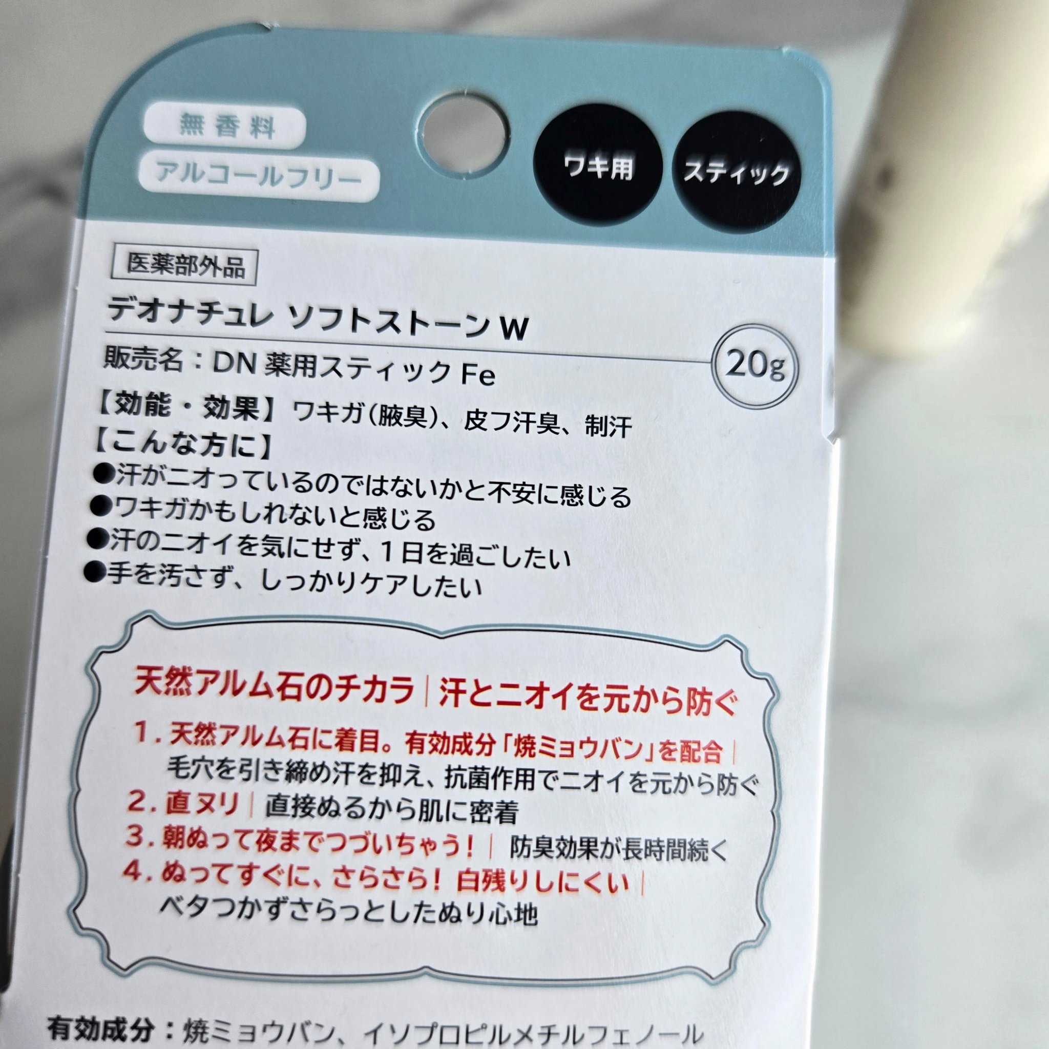 - \11年間ず~っと売上No.1*制汗デオドラント/ ワキの汗・ニオイを元から防ぐ 直ヌリスティック・無香料・アルコールフリー 天然アルム石に着目。有効成分「焼ミョウバン」を配合。 ◆◆ユーザーから選ばれる理由◆◆ ◆『天然アルム石のチカラ』に着目して、汗・ニオイを元から防ぐ! 「デオナチュレ ソフトストーンW」は、天然アルム石に着目。有効成分「焼ミョウバン」を配合し、汗・ニオイを元から防ぎます。 ◆ニオイの発生源・ワキに“直ヌリ”でしっかり密着し、朝ぬって夜まで続いちゃう! 忙しい朝でもサッとつけることができるスティックタイプで、夜まで長時間持続。 ◆すぐにサラサラ!ベタつき・白残りしにくい すぐに洋服を着ることができるので、時間のない朝にも嬉しい! ==注意== ●顔・粘膜を避け、除脱毛直後や肌に異常があるときは使用しないでください。●肌に異常が生じていないかよく注意してご使用ください。また、お肌に合わないとき、使用中に赤み、はれ、かゆみ、刺激、色抜け(白班等)や黒ずみ等の異常があらわれたときは、使用を中止し、皮フ科専門医などにご相談ください。●使用後はキャップをしっかり閉め、直射日光や高温多湿を避けて保管してください。●乳幼児の手の届かないところに置いてください。●スティックを出し過ぎて折れないようご注意ください。●衣類などにつかないようご注意ください。●本製品は残り少なくなりますと、構造上容器の底に中身が若干残ります。そのため、実際には容器に表記されております容量以上を充填しております。 販売名:DN薬用スティックFe *インテージSRI+制汗剤市場 2013年5月~2024年4月 ソフトストーンW(販売名:デオナチュレソフトストーンEX(リニューアル前処方)・DN薬用スティックFe)累計販売金額