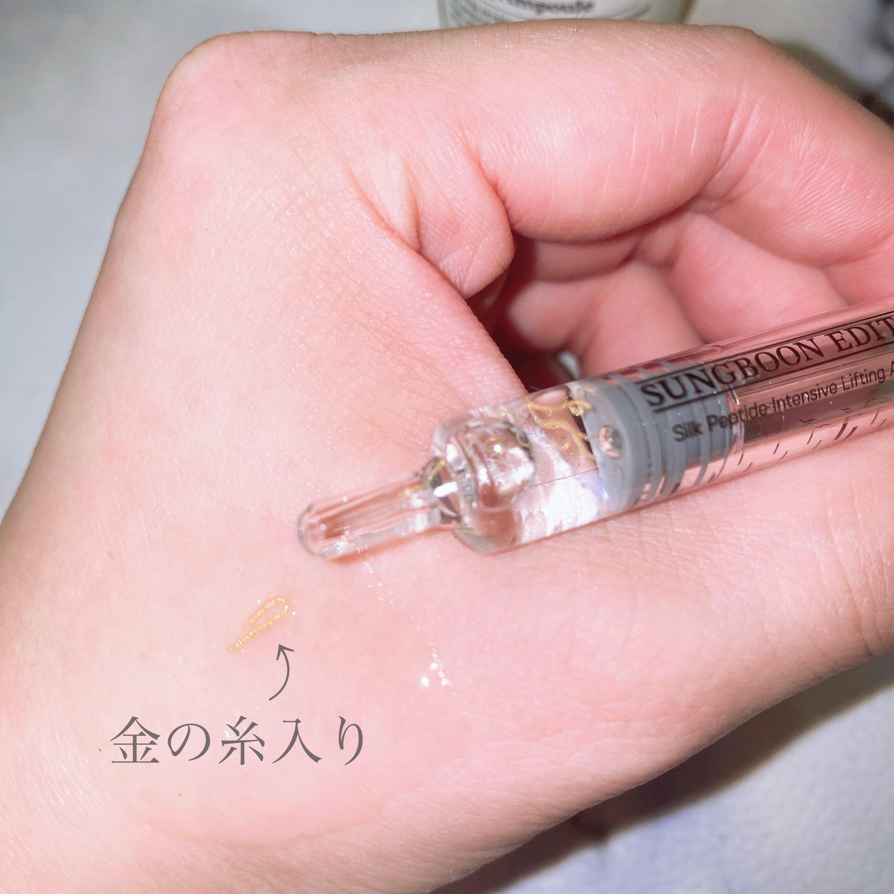 結構とろみのあるテクスチャー ベタつき感はあまりなくスッとお肌に伸ばしやすい 高濃度シルク成分+ペプチド13種に金色のコラーゲン系を配合 韓国のTVでも紹介された実力派アンプルなんです 注射器なので使用量の調節もしやすい 保管方法は注射器は挿しっぱなしでOK!