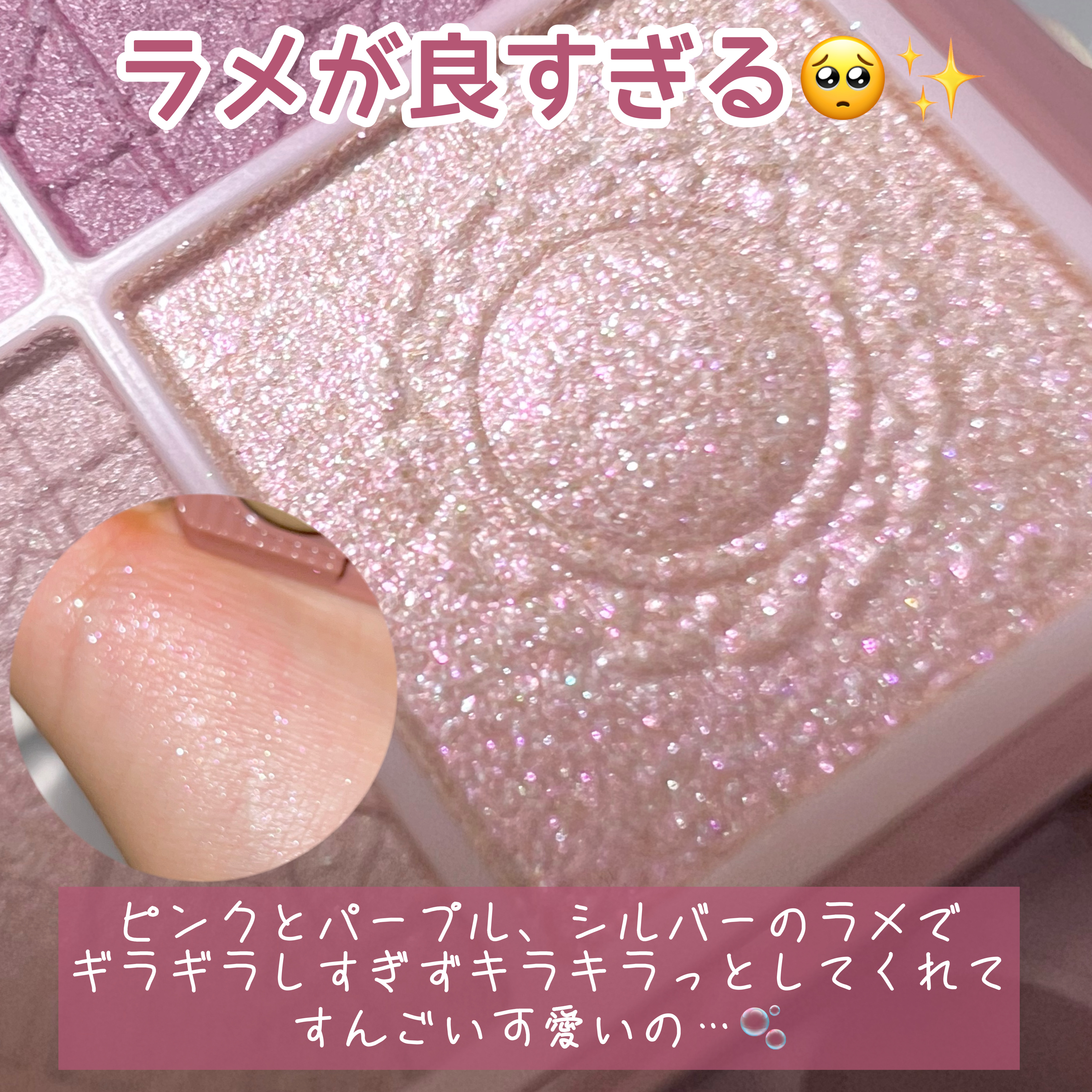 色味もラメも天才ですか🥹?盛れすぎ注意パレット🐷💕 イエベもブルベも使える、肌馴染み良すぎるローズピンクでまとめられたパレット! 色味めちゃくちゃ可愛いし、とにかくラメが天才すぎる✨️ キラキラ強くてポイントで乗せても、目尻とかに乗せても目に光が入って激カワ😍