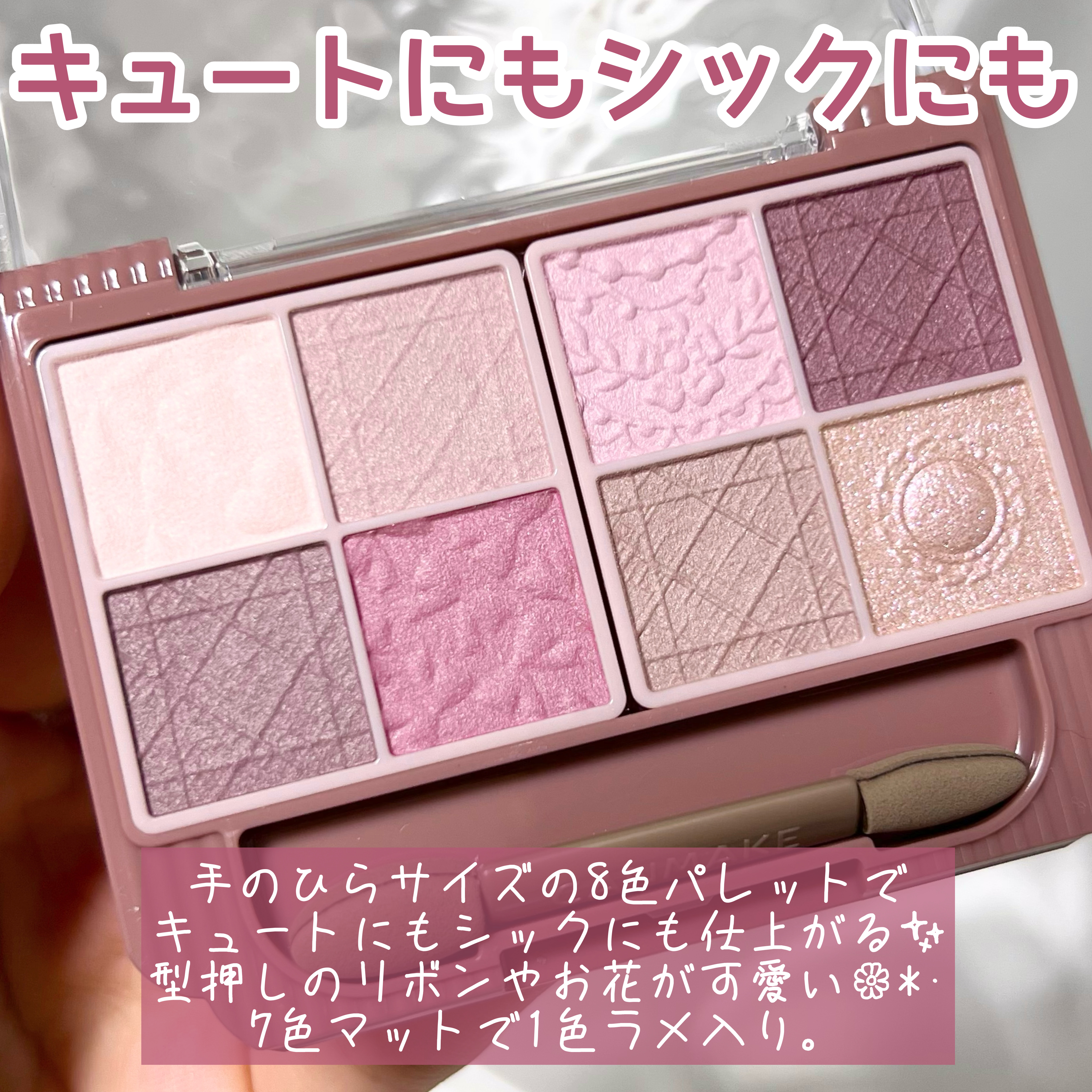 - いつでも一緒♡多色なのに持ち歩ける! 8色入りアイシャドウパレットのマットタイプ♪ 多色パレットでありながら、「持ち歩けること」と「外出先でもメイク直しができること」にこだわったアイシャドウパレット。 ダブルエンドチップ付です♪ マットが大好きな方にも、少し苦手意識がある方にも手に取っていただきたく全色マットor1色ラメ入りの構成にしています♪ (M01:全色マット、M02・M03:1色ラメ入り) 全体は同系色で統一しており、全色使いやすいパレット。 色の組み合わせは自由に♡自分好みのメイクを楽しめます! 【マット】 隠ぺい感とふわっと感を両立させた質感♪ なめらかで重ねても粉っぽくなりにくく、厚塗り感のない仕上がり。 伸びが良いのでムラになりにくく、しっとりフィットして仕上がりを長時間キープ✨ 【ラメ】 ラメ・パールだけがのる透明感のある仕上がり。 高輝度なガラスパール配合で、高見えする輝き✨ なめらかで粉っぽくならず、しっとり密着して仕上がりを長時間キープ! サラサラしたマットシャドウにもラメがしっかり密着する処方を追求しました♪ 蓋にはマット感を表現したすりガラス風のグラデーションデザインが、パウダー部分にはリボンやレース・ボタンの型押しが入っているなど、デザインにもこだわっています♡