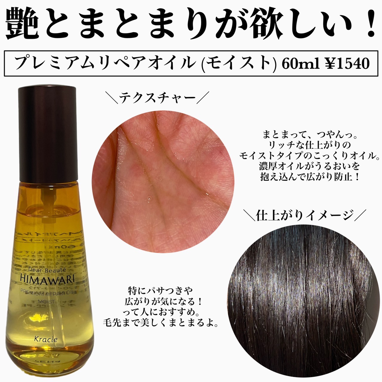 うねりやくせ、パサつきが気になる人におすすめで華やかなフローラルの香りがたまらなく好き💐 ミストやミルク、オイルなどを使い分けて自分の髪に合ったアイテムを選んでみてね🫧 ディアボーテ HIMAWARI*のリペアブローミスト、トリートメントリペアミルク、プレミアムリペアオイル(スムース)、プレミアムリペアオイル(モイスト)