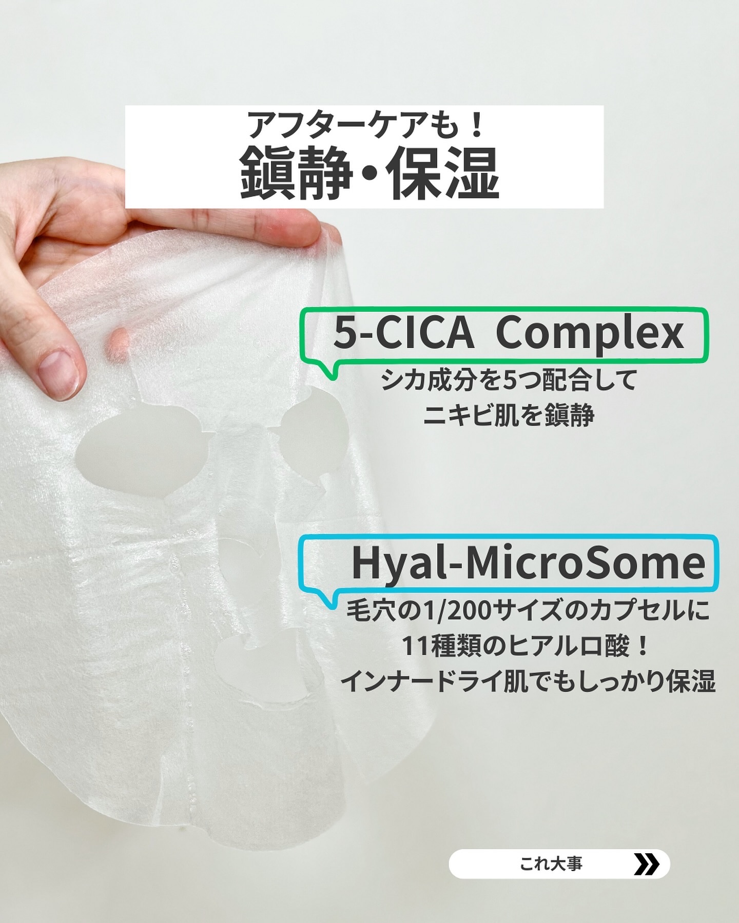 - たったの1分*!整肌水分ケア! 角質柔軟成分であるPHAで、肌の不要な角質をケアし、陶器肌のような、朝の使用で化粧崩れをしにくいなめらかな肌に整えます。 また、肌を整えてくれるシカ成分が5種入っており、外部からの刺激による肌荒れや乾燥を防いでくれます。 さらに、毛穴より200倍も小さくしたカプセルに、11種類ものヒアルロン酸をぎゅっと詰め込み、肌の角質層まで潤いを与えるので、夏場のエアコンによる乾燥も、冬場のひどい乾燥もケア! マスクパックは、朝も夜も使えますが、特に、朝のメイク前に使うのがおすすめです! 簡単に短い時間*で、長時間なめらかな肌を保ちます。 *お手入れの目安時間