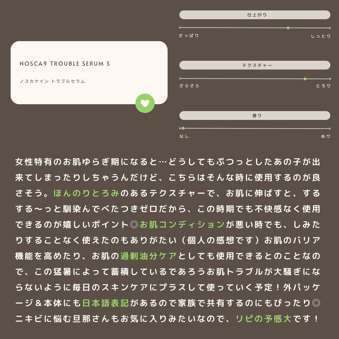 - <ノスカナイン トラブル セラム> 水、ペンチレングリコール、グリセリン、ヒアルロン酸Na、キサンタンガム、トコフェロール、エチルヘキシルグリセリン、ツボクサエキス、DPG、水添レシチン、セラミドNP、パンテノール、1,2-ヘキサンジオール、アラントイン、(アクリレーツ/アクリル酸アルキル(C10-30))クロスポリマー、(アクリロイルジメチルタウリンアンモニウム/VP)コポリマー、リンゴ果実エキス、ヨモギ葉エキス、コハク酸、(カプリリル/カプリル)グルコシド、コハク酸ジエトキシエチル、ツボクサ葉エキス、トロメタミン、ヒドロキシエチルウレア