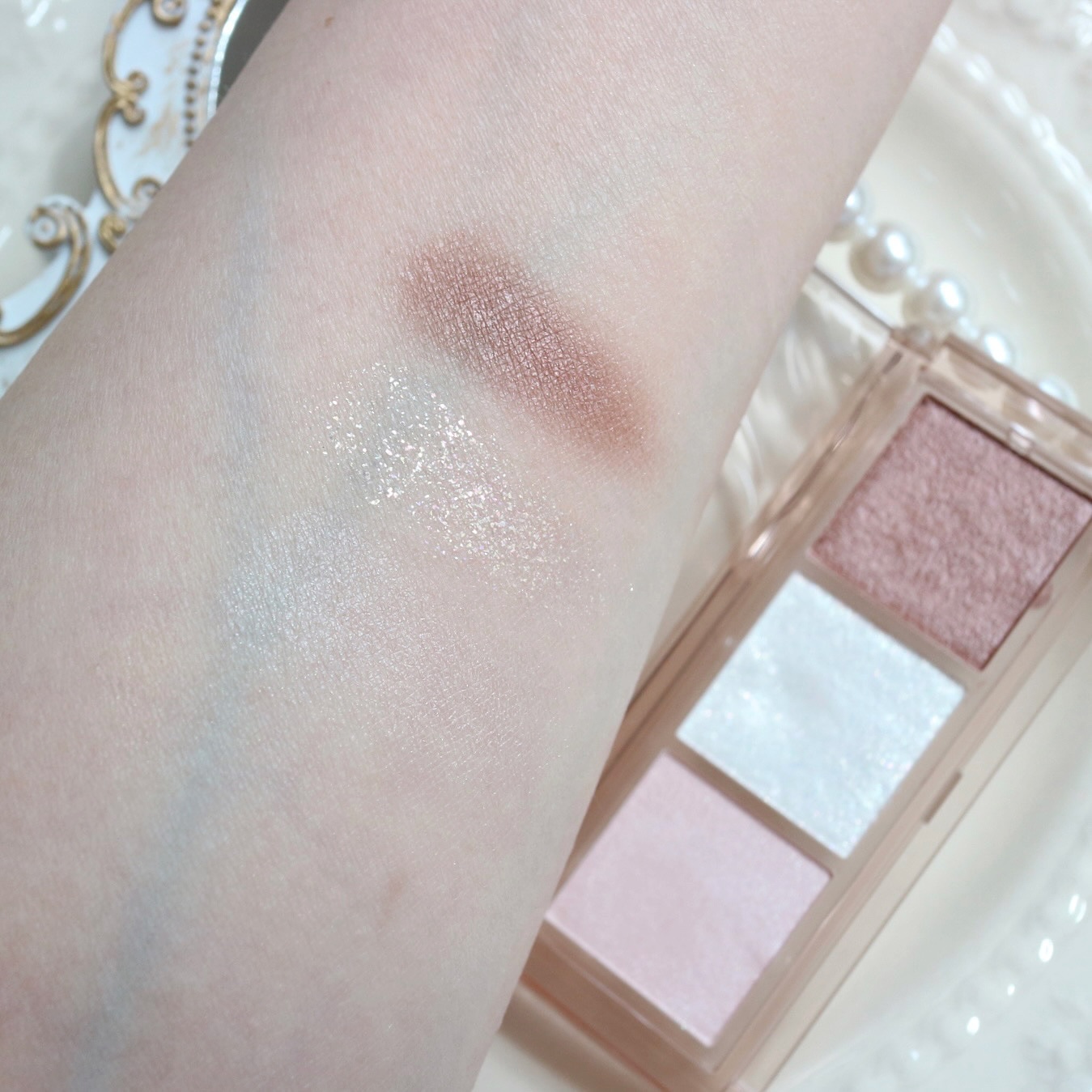 高輝度偏光パール×大粒グリッターを贅沢に配合した3色セットのアイカラー。角度によって色と輝きが変化する偏光パールが目元に魅力的な輝きを与えます! グリッターカラーがすごく可愛くてまぶた全体に塗ってもギラギラし過ぎない💫 パッケージはコンパクトでスリムなデザインでふた部分も水面のような立体感があり美しい💗