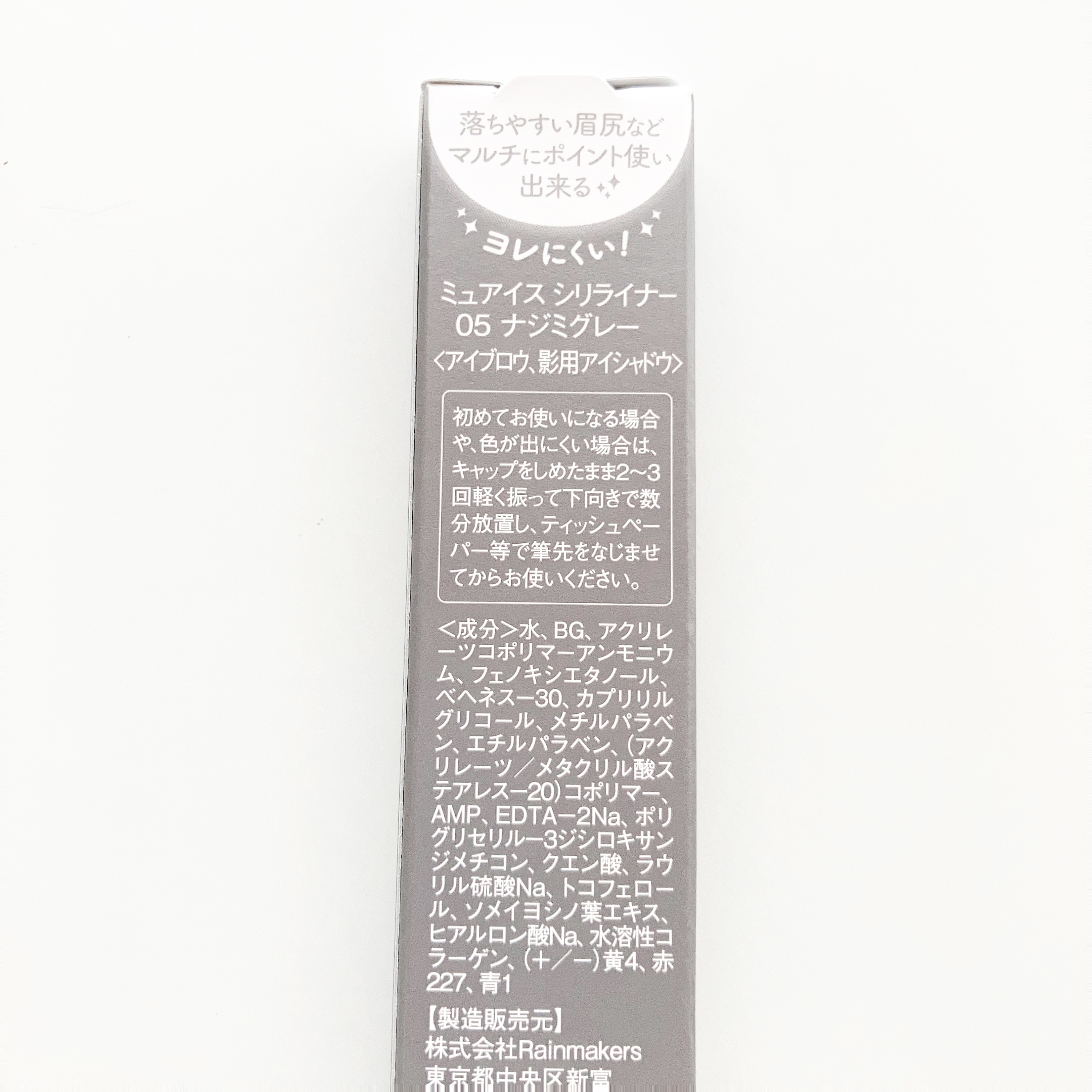 - <01 ブラウン> 水、BG、アクリレーツコポリマーアンモニウム、フェノキシエタノール、ベヘネス-30、カプリリルグリコール、メチルパラベン、エチルパラベン、(アクリレーツ/メタクリル酸ステアレス-20)コポリマー、EDTA-2Na、AMP、ポリグリセリル-3ジシロキサンジメチコン、クエン酸、ラウリル硫酸Na、ソメイヨシノ葉エキス、トコフェロール、ヒアルロン酸Na、水溶性コラーゲン、黄4、赤227、青1 <02 ナチュラルブラウン> 水、BG、アクリレーツコポリマーアンモニウム、フェノキシエタノール、ベヘネス-30、カプリリルグリコール、メチルパラベン、エチルパラベン、(アクリレーツ/メタクリル酸ステアレス-20)コポリマー、EDTA-2Na、AMP、ポリグリセリル-3ジシロキサンジメチコン、クエン酸、ラウリル硫酸Na、ソメイヨシノ葉エキス、トコフェロール、ヒアルロン酸Na、水溶性コラーゲン、黄4、赤227、青1 <03 ナミダピンク> 水、BG、アクリレーツコポリマーアンモニウム、フェノキシエタノール、ベヘネス-30、カプリリルグリコール、メチルパラベン、エチルパラベン、(アクリレーツ/メタクリル酸ステアレス-20)コポリマー、EDTA-2Na、AMP、ポリグリセリル-3ジシロキサンジメチコン、クエン酸、ラウリル硫酸Na、ソメイヨシノ葉エキス、トコフェロール、ヒアルロン酸Na、水溶性コラーゲン、黄4、赤227、青1 <04 ビターブラウン> 水、BG、アクリレーツコポリマーアンモニウム、フェノキシエタノール、ベヘネス-30、カプリリルグリコール、メチルパラベン、エチルパラベン、(アクリレーツ/メタクリル酸ステアレス-20)コポリマー、AMP、EDTA-2Na、ポリグリセリル-3ジシロキサンジメチコン、クエン酸、ラウリル硫酸Na、トコフェロール、ソメイヨシノ葉エキス、ヒアルロン酸Na、水溶性コラーゲン、黄4、赤227、青1 <05 ナジミグレー> 水、BG、アクリレーツコポリマーアンモニウム、フェノキシエタノール、ベヘネス-30、カプリリルグリコール、メチルパラベン、エチルパラベン、(アクリレーツ/メタクリル酸ステアレス-20)コポリマー、AMP、EDTA-2Na、ポリグリセリル-3ジシロキサンジメチコン、クエン酸、ラウリル硫酸Na、トコフェロール、ソメイヨシノ葉エキス、ヒアルロン酸Na、水溶性コラーゲン、黄4、赤227、青1 <SP01 レンガブラウン(限定)> 水、BG、アクリレーツコポリマーアンモニウム、フェノキシエタノール、ベヘネス-30、カプリリルグリコール、メチルパラベン、エチルパラベン、(アクリレーツ/メタクリル酸ステアレス-20)コポリマー、AMP、EDTA-2Na、ポリグリセリル-3ジシロキサンジメチコン、クエン酸、ラウリル硫酸Na、トコフェロール、ソメイヨシノ葉エキス、ヒアルロン酸Na、水溶性コラーゲン、(+/-)黄4、赤227、青1 <SP02 カシスブラウン(限定)> 水、BG、アクリレーツコポリマーアンモニウム、フェノキシエタノール、ベヘネス-30、カプリリルグリコール、メチルパラベン、エチルパラベン、(アクリレーツ/メタクリル酸ステアレス-20)コポリマー、AMP、EDTA-2Na、ポリグリセリル-3ジシロキサンジメチコン、クエン酸、ラウリル硫酸Na、トコフェロール、ソメイヨシノ葉エキス、ヒアルロン酸Na、水溶性コラーゲン、(+/-)黄4、赤227、青1