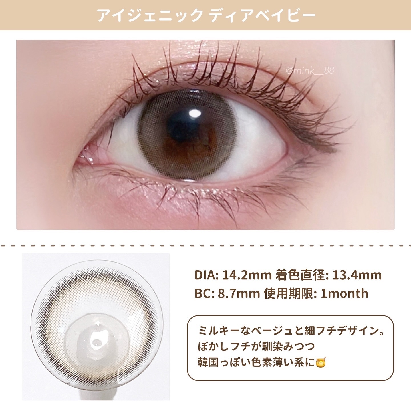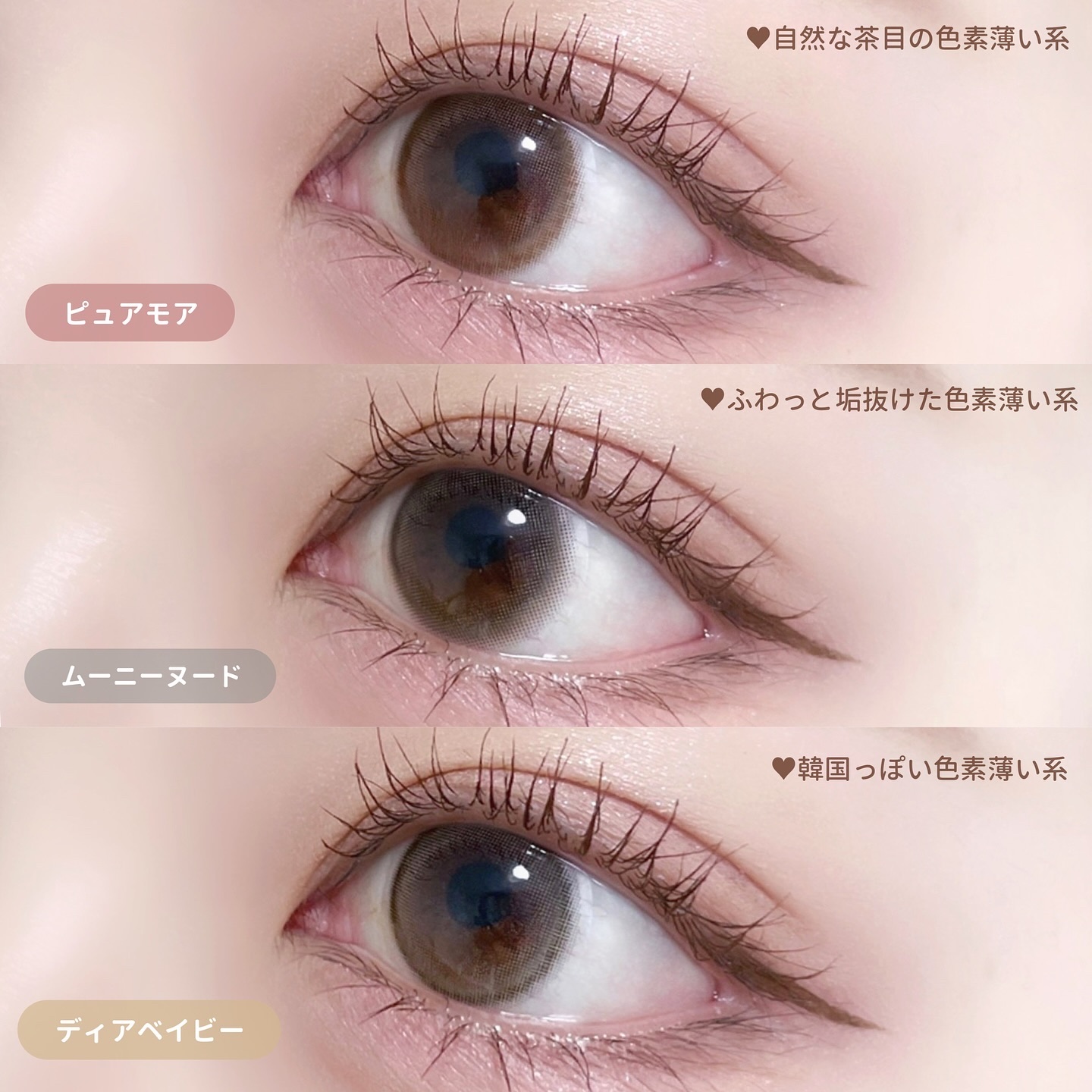 〖マンスリーの色素薄い系カラコン!〗\トレンド感満載の透明感レンズ!/❤︎EYEGENIC<ピュアモア/ムーニームード/ディアベイビー>✓DIA14.2mm✓BC8.7mm✓着色直径13.4mm/13.2mm✓含水率38.5%✓使用期限...