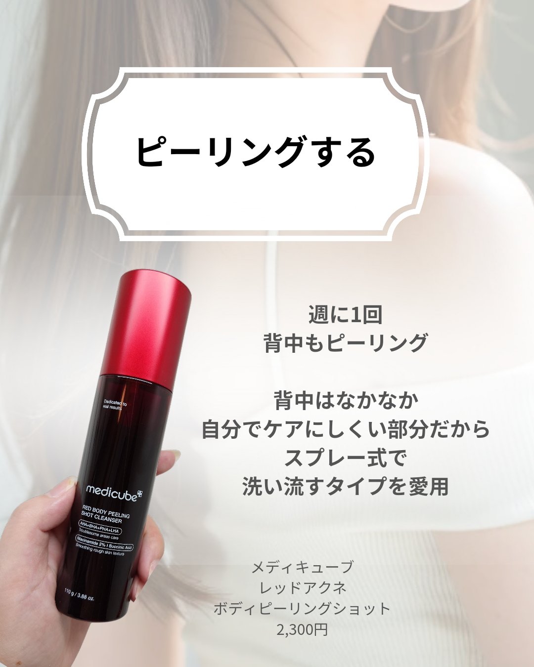 ボディのトラブルや過剰な皮脂や角質の悩み、でこぼこした皮膚状態に悩んでいる方向けのピーリングです🥹 赤っぽい液体で(ボルシチみたい)つけて、伸ばして、流すだけです🚿 背中ニキビがたまにできてしまって、予防として何かできないかなと思ってたのでボディのピーリングができるのはすごく嬉しいです!!