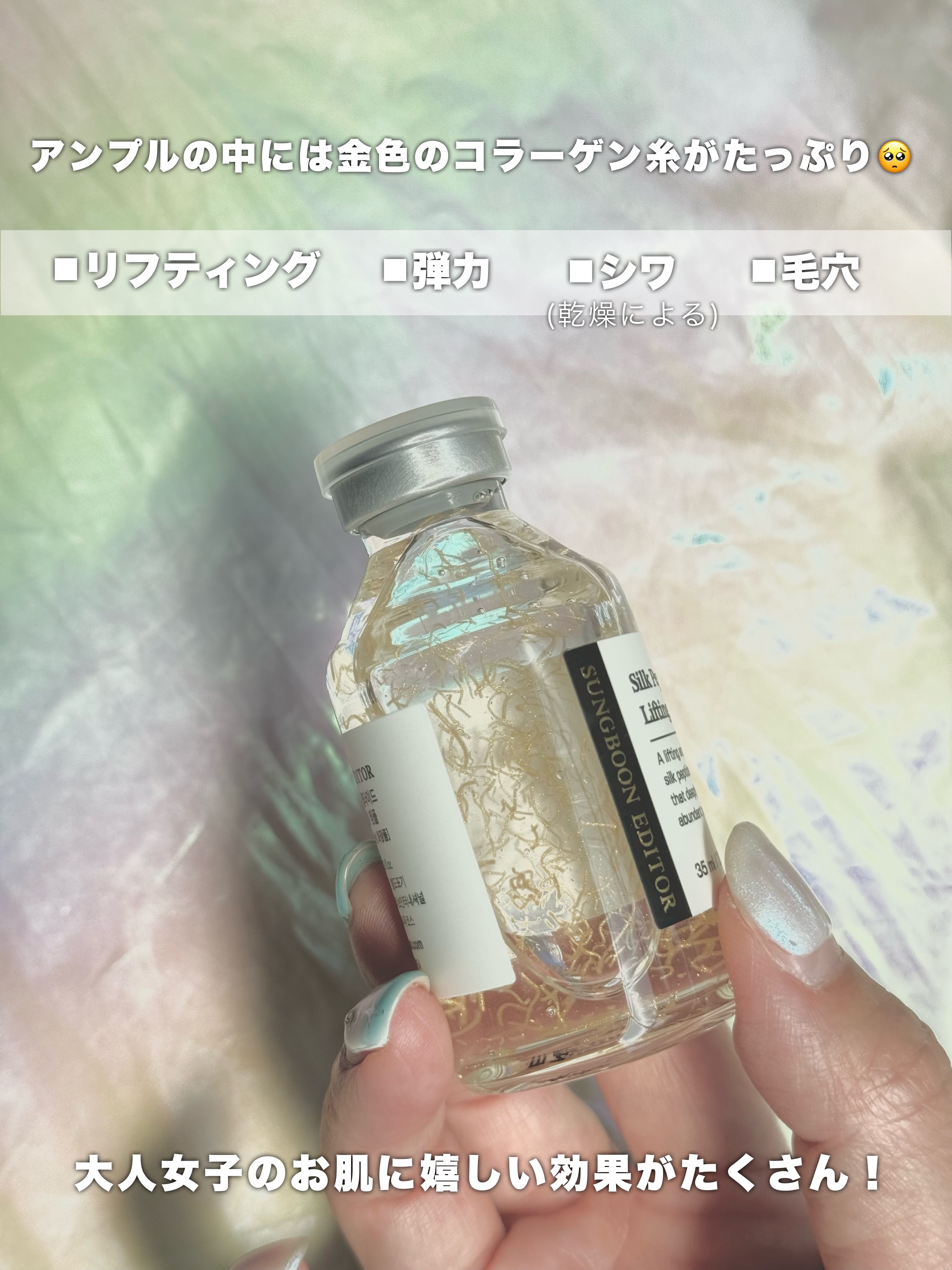 ゴールドの糸が斬新な注射器のようなアンプル!成分エディターシルクペプチドインテンシブリフティングアンプルを使ってみたよ。@sungbooneditor_jp4年連続で"ブランド大賞"を受賞とOLIVEYOUNGでも全体ランキング1位を獲得する...
