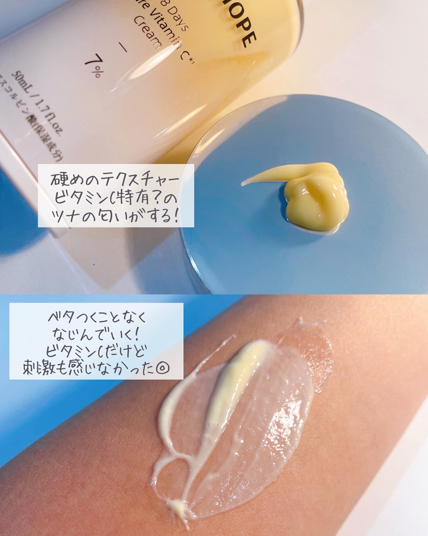 VARI:HOPEは多様性と美の希望を結ぶという願いを込めて名付けられたブランドです。 純粋ビタミンC70000ppm配合のクリーム。二重層安定化技術で肌により浸透しやすく、より保湿しやすくなっています。 乳液とクリームの中間のような柔らかめのこっくりテクスチャー。少量で伸びがいいのも嬉しい✨