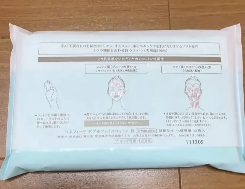 - 肌に不要なものを拭き取りリセットするメッシュ面とスキンケアを肌になじませるソフト面の2つの機能をあわせ持つコットン(天然綿100%)。 コットンサイズ 60mm×75mm