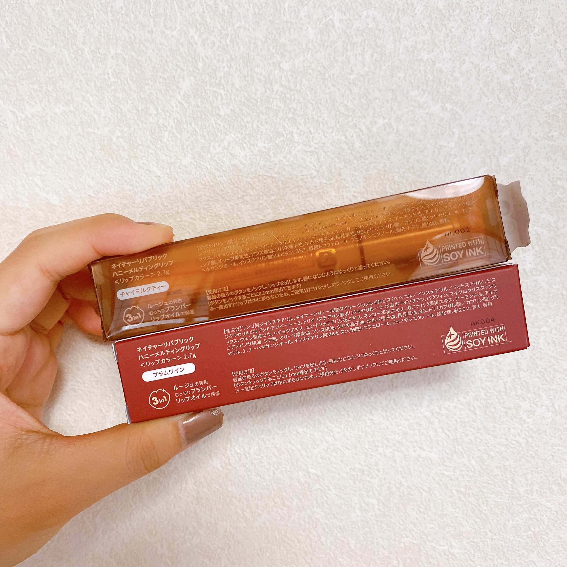 - <01 アプリコットティー> リンゴ酸ジイソステアリル、ダイマージリノール酸ダイマージリノレイルビス(ベヘニル/イソステアリル/フィトステリル)、ビスジグリセリルポリアシルアジペート-2、トリイソステアリン酸ポリグリセリル-2、水添ポリイソブテン、パラフィン、マイクロクリスタリンワックス、ウルシ果皮ロウ、ハチミツエキス、センチフォリアバラ花エキス、マンゴー果実エキス、カニナバラ果実エキス、アーモンド油、アルガニアスピノサ核油、アンズ核油、オリーブ果実油、シア脂、ツバキ種子油、ホホバ種子油、月見草油、BG、トリ(カプリル酸/カプリン酸)グリセリル、1,2-ヘキサンジオール、イソステアリン酸ソルビタン、酢酸トコフェロール、フェノキシエタノール、酸化鉄、酸化チタン、赤202、香料 <02 イチジクミルク> リンゴ酸ジイソステアリル、ダイマージリノール酸ダイマージリノレイルビス(ベヘニル/イソステアリル/フィトステリル)、ビスジグリセリルポリアシルアジペート-2、トリイソステアリン酸ポリグリセリル-2、水添ポリイソブテン、パラフィン、マイクロクリスタリンワックス、ウルシ果皮ロウ、ハチミツエキス、センチフォリアバラ花エキス、マンゴー果実エキス、カニナバラ果実エキス、アーモンド油、アルガニアスピノサ核油、シア脂、オリーブ果実油、アンズ核油、ツバキ種子油、ホホバ種子油、月見草油、BG、トリ(カプリル酸/カプリン酸)グリセリル、1,2-ヘキサンジオール、イソステアリン酸ソルビタン、酢酸トコフェロール、フェノキシエタノール、酸化鉄、酸化チタン、赤202、青1、香料 <03 ベリーヨーグルト> リンゴ酸ジイソステアリル、ダイマージリノール酸ダイマージリノレイルビス(ベヘニル/イソステアリル/フィトステリル)、ビスジグリセリルポリアシルアジペート-2、トリイソステアリン酸ポリグリセリル-2、水添ポリイソブテン、パラフィン、マイクロクリスタリンワックス、ウルシ果皮ロウ、ハチミツエキス、センチフォリアバラ花エキス、マンゴー果実エキス、カニナバラ果実エキス、アーモンド油、アルガニアスピノサ核油、シア脂、オリーブ果実油、アンズ核油、ツバキ種子油、ホホバ種子油、月見草油、BG、トリ(カプリル酸/カプリン酸)グリセリル、1,2-ヘキサンジオール、イソステアリン酸ソルビタン、酢酸トコフェロール、フェノキシエタノール、酸化鉄、酸化チタン、赤202、黄5、香料 <04 ザクロサワー> リンゴ酸ジイソステアリル、ダイマージリノール酸ダイマージリノレイルビス(ベヘニル/イソステアリル/フィトステリル)、ビスジグリセリルポリアシルアジペート-2、トリイソステアリン酸ポリグリセリル-2、水添ポリイソブテン、パラフィン、マイクロクリスタリンワックス、ウルシ果皮ロウ、ハチミツエキス、センチフォリアバラ花エキス、マンゴー果実エキス、カニナバラ果実エキス、アーモンド油、アルガニアスピノサ核油、シア脂、オリーブ果実油、アンズ核油、ツバキ種子油、ホホバ種子油、月見草油、BG、トリ(カプリル酸/カプリン酸)グリセリル、1,2-ヘキサンジオール、イソステアリン酸ソルビタン、酢酸トコフェロール、フェノキシエタノール、黄5、赤202、香料 <05 プラムワイン> リンゴ酸ジイソステアリル、ダイマージリノール酸ダイマージリノレイルビス(ベヘニル/イソステアリル/フィトステリル)、ビスジグリセリルポリアシルアジペート-2、トリイソステアリン酸ポリグリセリル-2、水添ポリイソブテン、パラフィン、マイクロクリスタリンワックス、ウルシ果皮ロウ、ハチミツエキス、センチフォリアバラ花エキス、マンゴー果実エキス、カニナバラ果実エキス、アーモンド油、アルガニアスピノサ核油、シア脂、オリーブ果実油、アンズ核油、ツバキ種子油、ホホバ種子油、月見草油、BG、トリ(カプリル酸/カプリン酸)グリセリル、1,2-ヘキサンジオール、イソステアリン酸ソルビタン、酢酸トコフェロール、フェノキシエタノール、酸化鉄、赤202、青1、香料 <06 チャイミルクティー> リンゴ酸ジイソステアリル、ダイマージリノール酸ダイマージリノレイルビス(ベヘニル/イソステアリル/フィトステリル)、ビスジグリセリルポリアシルアジペート-2、トリイソステアリン酸ポリグリセリル-2、水添ポリイソブテン、パラフィン、マイクロクリスタリンワックス、ハチミツエキス、センチフォリアバラ花エキス、マンゴー果実エキス、カニナバラ果実エキス、アーモンド油、アルガニアスピノサ核油、シア脂、オリーブ果実油、アンズ核油、ツバキ種子油、ホホバ種子油、月見草油、BG、トリ(カプリル酸/カプリン酸)グリセリル、水、1,2-ヘキサンジオール、イソステアリン酸ソルビタン、BHT、酢酸トコフェロール、フェノキシエタノール、酸化チタン、酸化鉄、香料 <21 ダーティチョコ> リンゴ酸ジイソステアリル、ダイマージリノール酸ダイマージリノレイルビス(ベヘニル/イソステアリル/フィトステリル)、ビスジグリセリルポリアシル
