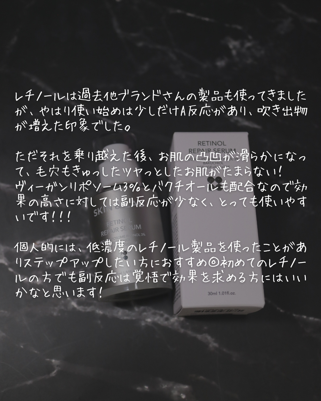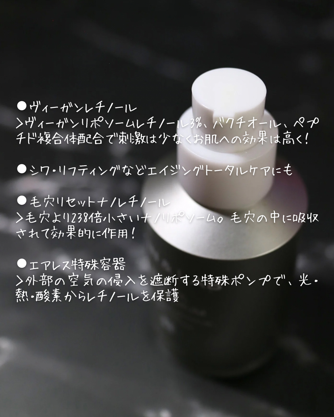 植物性で刺激を減らしたヴィーガンリポソームレチノール。3月に発売したSKIN&LABの新商品! 毛穴より238倍小さいヴィーガンリポソームレチノールが3%配合され、メラニンの生成を抑えしみそばかすを防ぎ、毛穴ケアや肌ハリをアップしてくれるセラム 柔らかいテクスチャーのクリーム様のセラム。すーっと伸びて肌馴染みがよく、ベタつかない使用感で心地よいです。