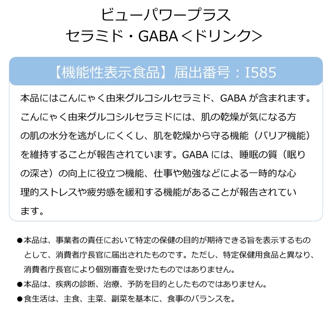 - 〔機能性表示食品〕 こんにゃく由来グルコシルセラミドとGABAのW成分を配合したドリンクタイプの機能性表示食品 肌の乾燥が気になる方の肌の水分を逃がしにくくし、肌を乾燥から守る機能(バリア機能)を維持することが報告されている「こんにゃく由来グルコシルセラミド」と、睡眠の質(眠りの深さ)の向上に役立つ機能、仕事や勉強などによる一時的な心理的ストレスや疲労感を緩和することが報告されている「GABA」を配合。 ○ 機能性関与成分 こんにゃく由来グルコシルセラミド600㎍、GABA100mg ○ 低カロリー(2.5kcal)、ノンカフェイン ○ グレープフルーツ味(果汁4%)