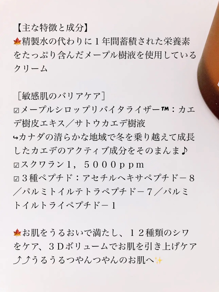 メープルシロップのようなしっとりとしたテクスチャのスキンケアです。 メープルの樹液を凝縮したシロップのように糸を引くほどとろみのあるテクスチャ。しっとりもちもちのお肌に♡ 意外とお肌の上では重たくなく、ベタつき感はありません。ふっくらとハリのあるお肌に。