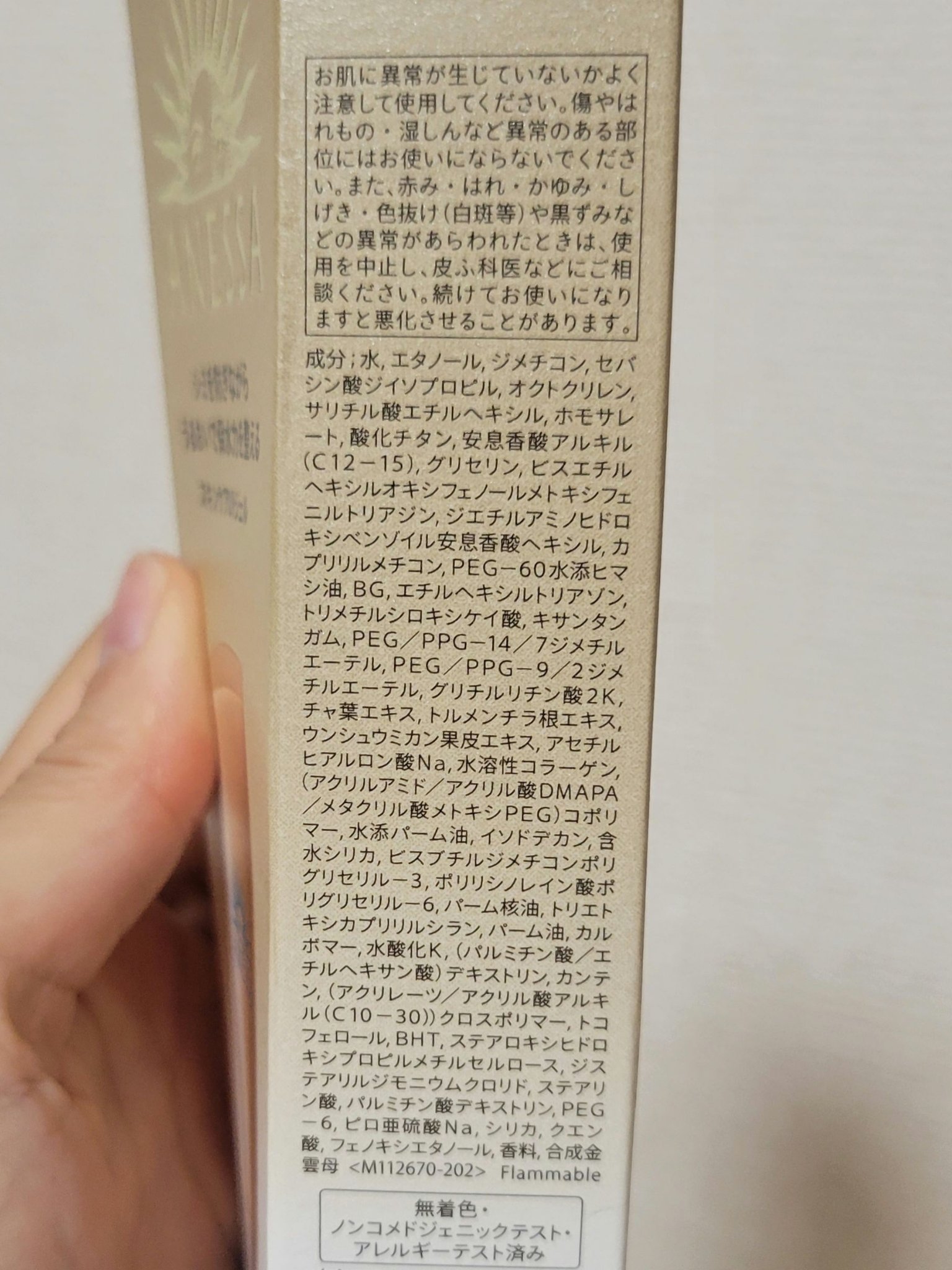 - <90g> 水、エタノール、ジメチコン、セバシン酸ジイソプロピル、オクトクリレン、サリチル酸エチルヘキシル、ホモサレート、酸化チタン、安息香酸アルキル(C12-15)、グリセリン、ビスエチルヘキシルオキシフェノールメトキシフェニルトリアジン、ジエチルアミノヒドロキシベンゾイル安息香酸ヘキシル、カプリリルメチコン、PEG-60水添ヒマシ油、BG、エチルヘキシルトリアゾン、トリメチルシロキシケイ酸、キサンタンガム、PEG/PPG-14/7ジメチルエーテル、PEG/PPG-9/2ジメチルエーテル、グリチルリチン酸2K、チャ葉エキス、トルメンチラ根エキス、ウンシュウミカン果皮エキス、アセチルヒアルロン酸Na、水溶性コラーゲン、(アクリルアミド/アクリル酸DMAPA/メタクリル酸メトキシPEG)コポリマー、水添パーム油、イソドデカン、含水シリカ、ビスブチルジメチコンポリグリセリル-3、ポリリシノレイン酸ポリグリセリル-6、パーム核油、トリエトキシカプリリルシラン、パーム油、カルボマー、水酸化K、(パルミチン酸/エチルヘキサン酸)デキストリン、カンテン、(アクリレーツ/アクリル酸アルキル(C10-30))クロスポリマー、トコフェロール、BHT、ステアロキシヒドロキシプロピルメチルセルロース、ジステアリルジモニウムクロリド、ステアリン酸、パルミチン酸デキストリン、PEG-6、ピロ亜硫酸Na、シリカ、クエン酸、フェノキシエタノール、香料、合成金雲母
