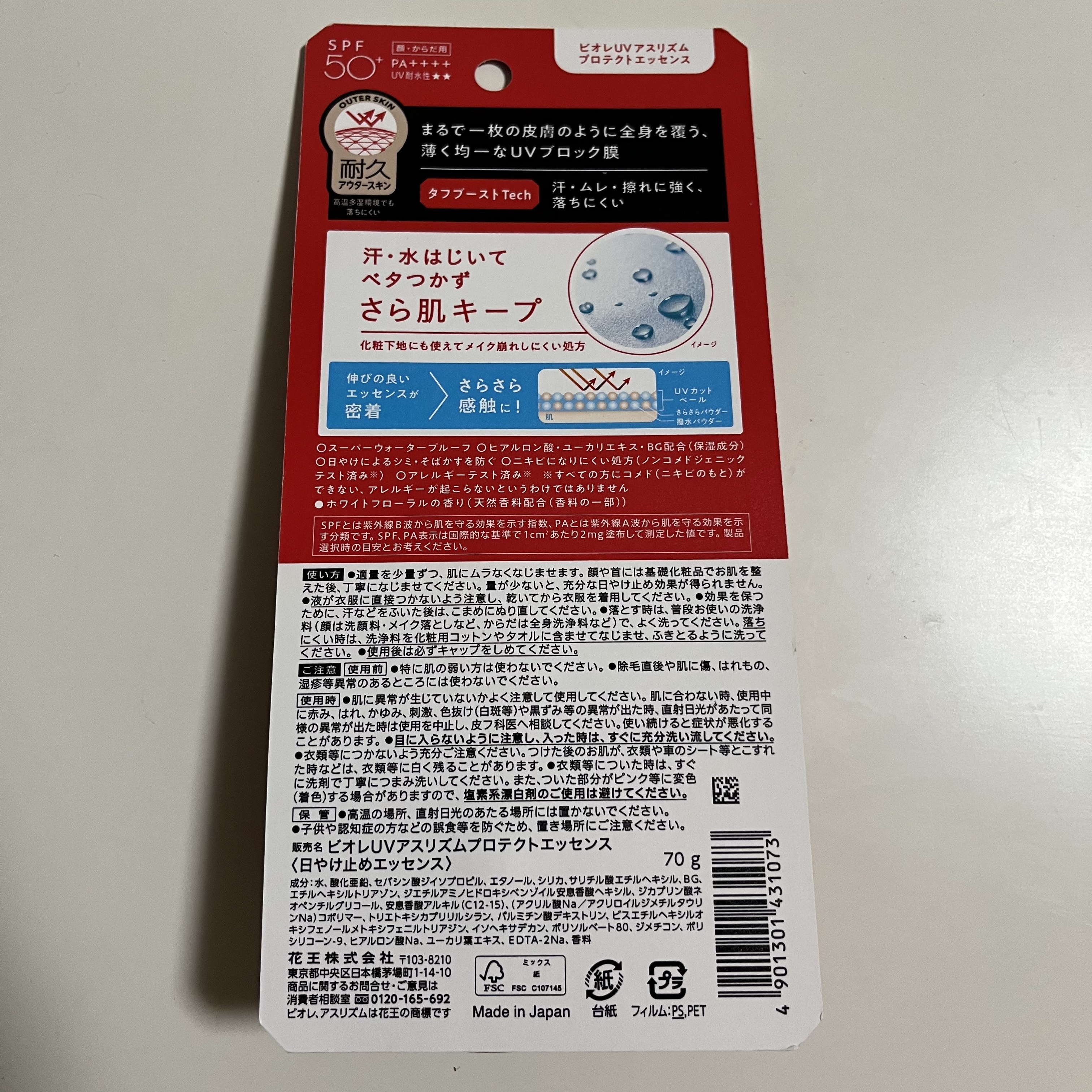 - <ビオレUV アスリズム プロテクトエッセンス> 水、酸化亜鉛、セバシン酸ジイソプロピル、エタノール、シリカ、サリチル酸エチルヘキシル、BG、エチルヘキシルトリアゾン、ジエチルアミノヒドロキシベンゾイル安息香酸ヘキシル、ジカプリン酸ネオペンチルグリコール、安息香酸アルキル(C12-15)、(アクリル酸Na/アクリロイルジメチルタウリンNa)コポリマー、トリエトキシカプリリルシラン、パルミチン酸デキストリン、ビスエチルヘキシルオキシフェノールメトキシフェニルトリアジン、イソヘキサデカン、ポリソルベート80、ジメチコン、ポリシリコーン-9、ヒアルロン酸Na、ユーカリ葉エキス、EDTA-2Na、香料