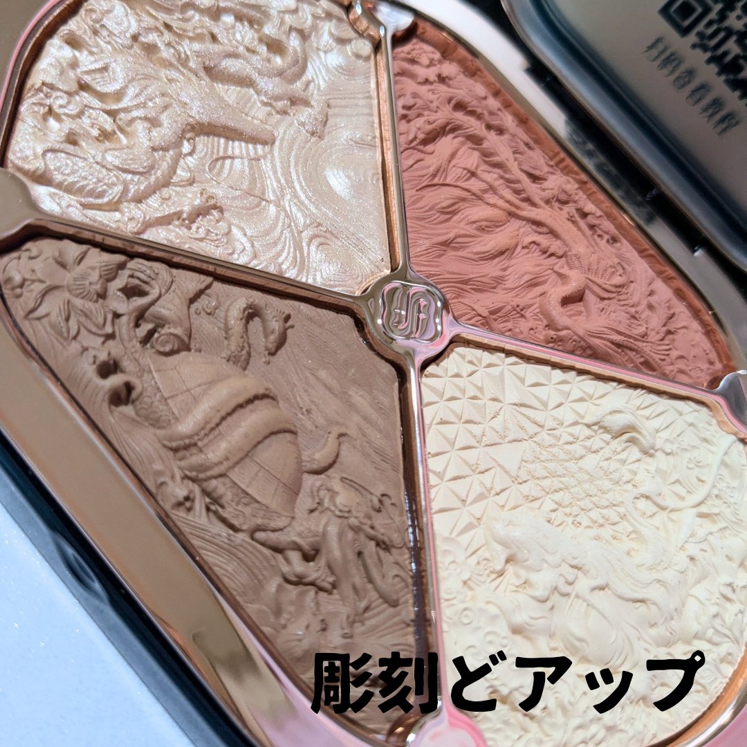 - ・中国伝統の彫刻技法を通じて、幸せと好運をもたらす四大霊獣(ヨンダイレイジュウ) 「青龍(セイリュウ)」「朱雀(スザク)」「白虎(ビャッコ)」「玄武(ゲンブ)」を日常のメイクパレットに再現。 ・日常で使いやすい4色入りで、アイシャドウ、ハイライト、シェーディングやチークとしても使え、パレット一つで、顔に立体感を引き出すことができる。 ・しっとりした質感が肌に馴染みやすく、ぼかしやすい。 ラメ&マット、二つの質感の粉質の組み合わせで、よりメイクを楽しめる。