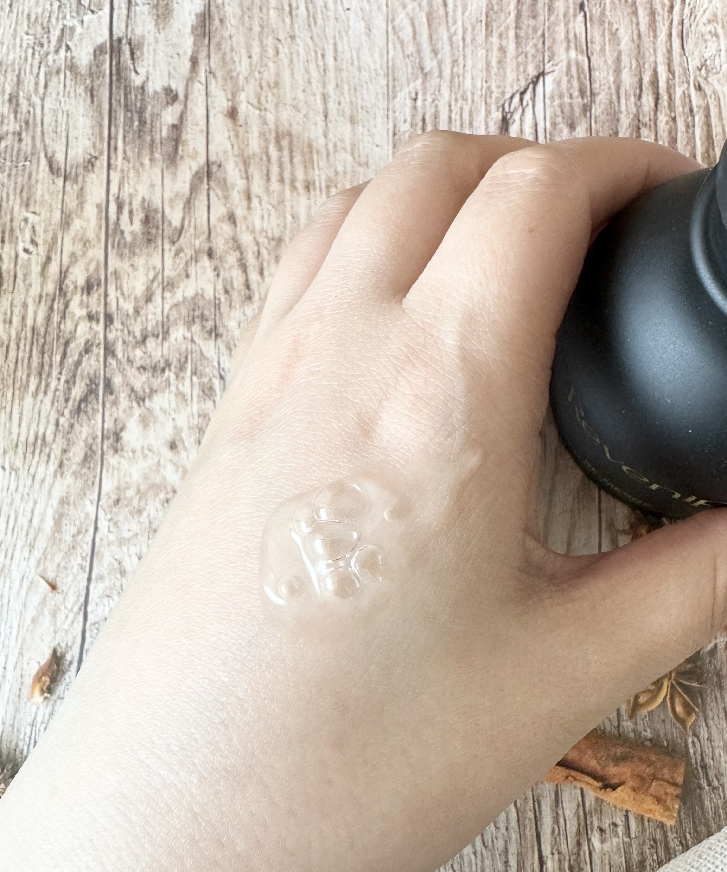 とろみのあるテクスチャですが、お肌にのせると不思議とすーっとなじんでいきます。ベタつかない、しっとりするような使用感です。とてもまろやかです。使用量の目安は500円玉大くらいだそう。ハンドプレスでじっくりなじませて、肌が手にピタッと吸い付いた...