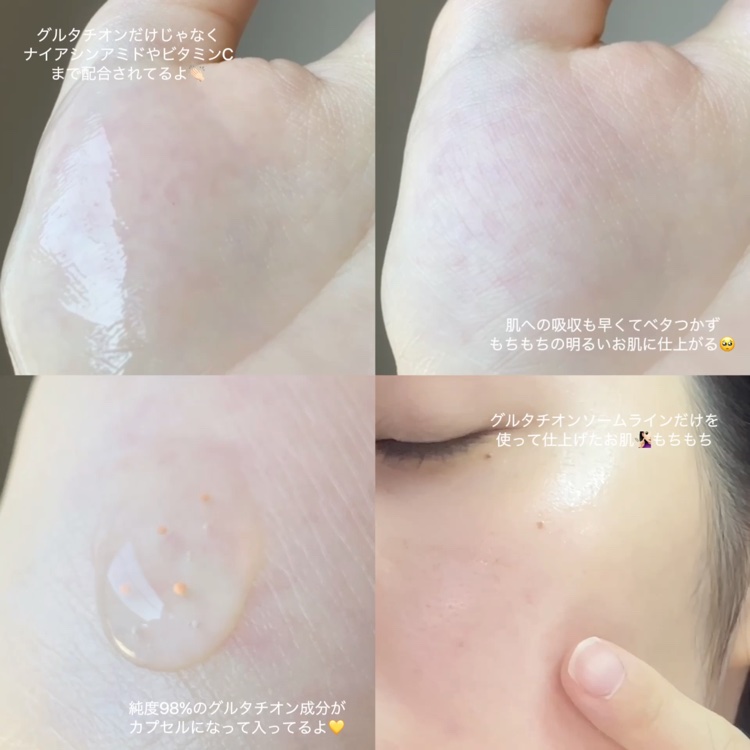 - 美白成分として人気を集めているグルタチオン成分を含んだグルタチオンソームシリーズ。 グルタチオンソームが詰まったコアカプセルが肌に触れた瞬間、弾けて浸透し 肌のくすみ、しみに集中アプローチ。 肌の透明感を高め、つるんとした綺麗な素肌に仕上げるカプセルセラム。