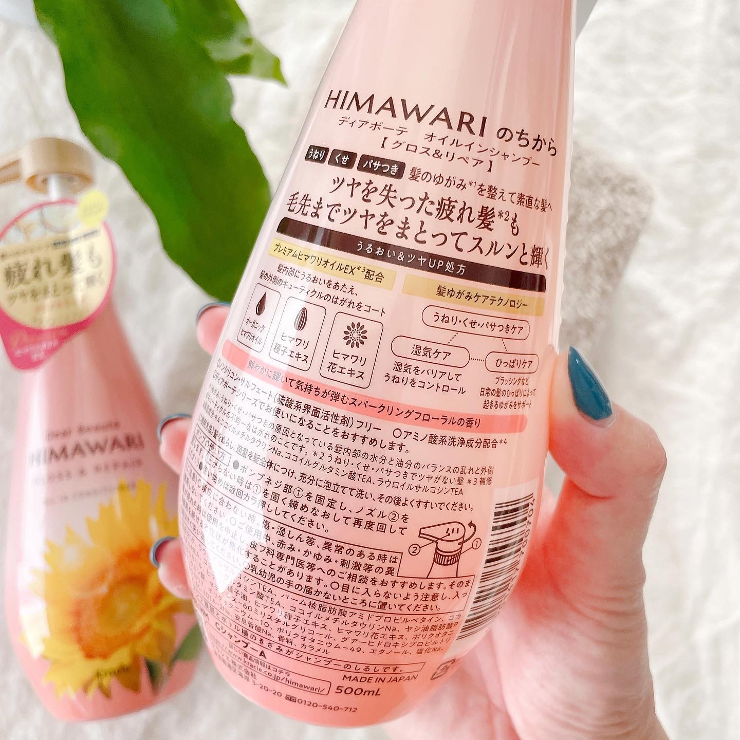 うるおい&ツヤUP。ツヤをまとってするんと輝く。天使の輪が誕生。 ヒマワリ種子油・種子エキス・花エキスで髪のダメージを補修&保湿 ドライした後もふんわりと香るフローラルの香りが上品。ヒマワリが描かれたピンクのボトルが目印♪