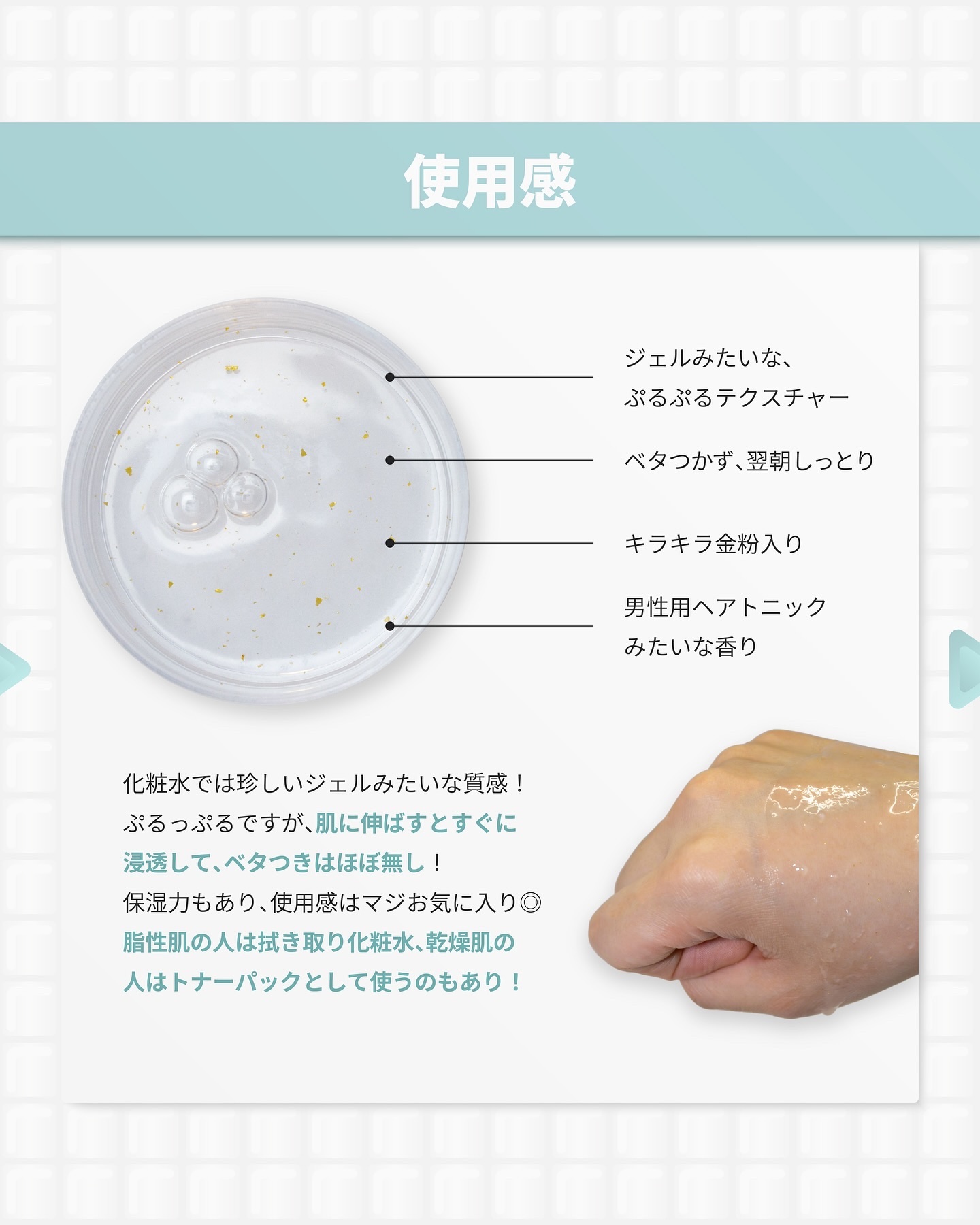 | とてもサラッとしたテクスチャで、スキンケアアイテムのベタつきが嫌いな方にはとても良さそう。 | 詳細を見る |