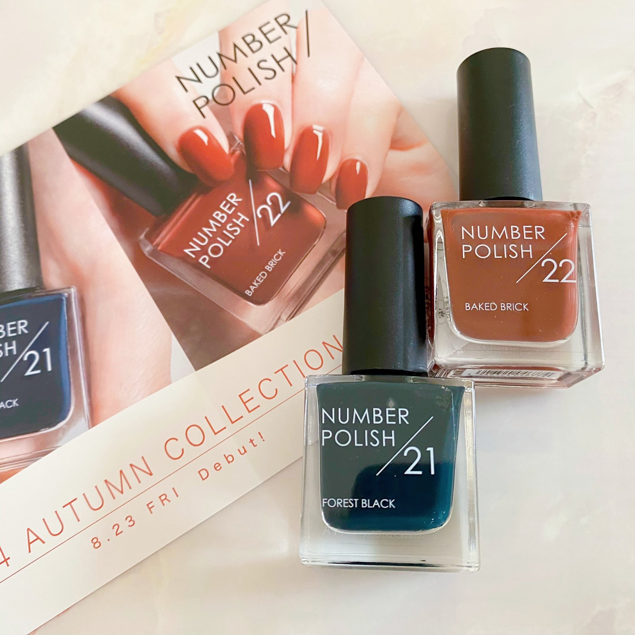 秋冬トレンドのモスグリーンやブラウンを潜ませることで、深みと奥行き感を演出したおしゃれカラーが二種❕❕ ナンバーポリッシュはローンチしてからすぐベスコスを受賞するほどの超優秀アイテムなんです🍁🍂 攻めたカラーから、日常で使いやすいベージュ変更が美しいカラーなど多数のカラーがそろっているブランド❕❕