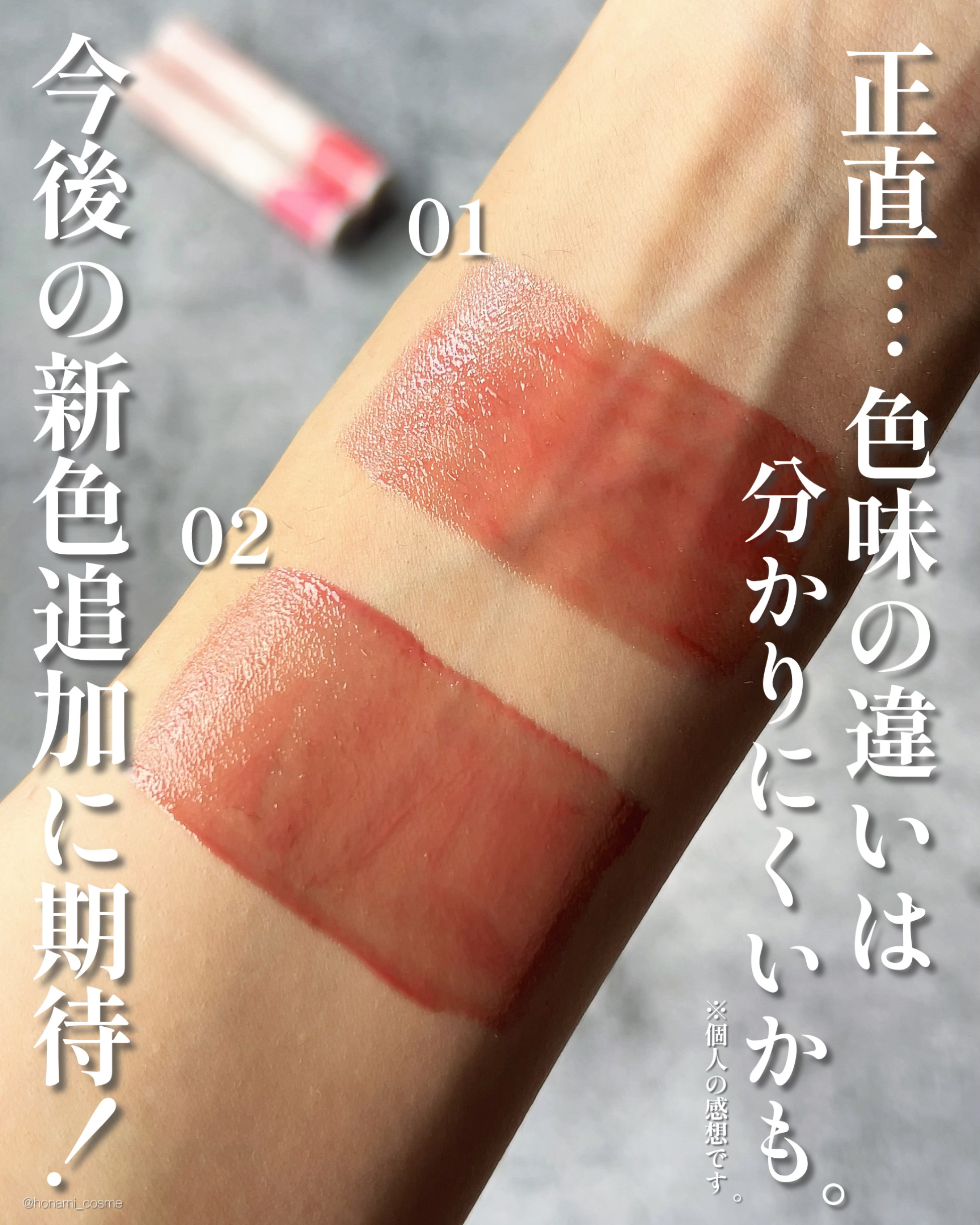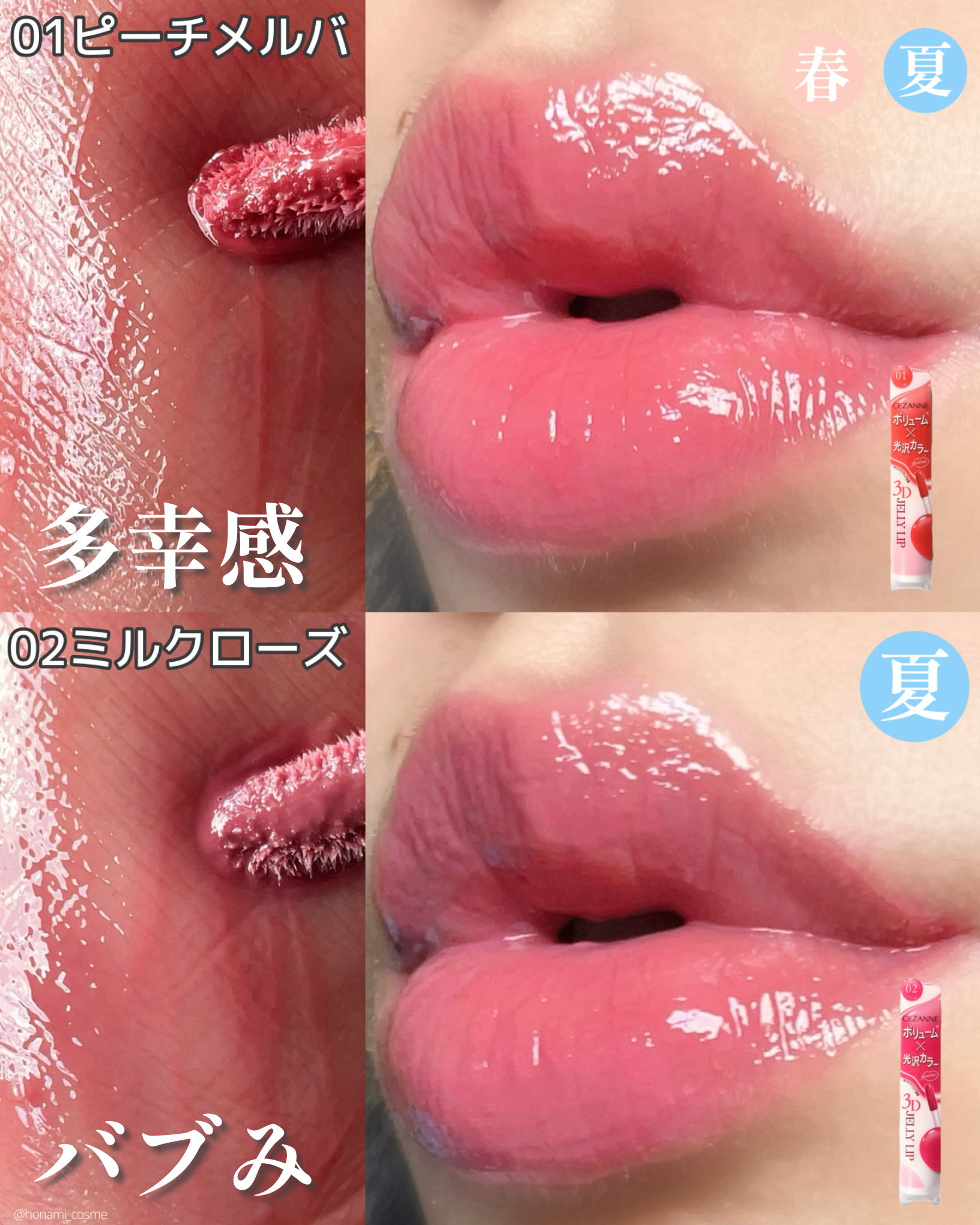 - <01 ピーチメルバ> ミネラルオイル、水添ポリイソブテン、マイクロクリスタリンワックス、リンゴ酸ジイソステアリル、ヒドロキシステアリン酸エチルヘキシル、パルミチン酸デキストリン、ジメチルシリル化シリカ、フェノキシエタノール、メチルパラベン、トコフェロール、シメチコン、水、BG、ユズ果実エキス、モウソウチクたけのこ皮エキス、チャ葉エキス、セイヨウハッカ葉エキス、酸化チタン、黄5、赤202、黄4、酸化鉄、ラウロイルリシン、赤104(1)、水酸化Al、シリカ <02 ミルクローズ> ミネラルオイル、水添ポリイソブテン、マイクロクリスタリンワックス、リンゴ酸ジイソステアリル、ヒドロキシステアリン酸エチルヘキシル、パルミチン酸デキストリン、ジメチルシリル化シリカ、フェノキシエタノール、メチルパラベン、トコフェロール、シメチコン、水、BG、ユズ果実エキス、モウソウチクたけのこ皮エキス、チャ葉エキス、セイヨウハッカ葉エキス、酸化チタン、黄5、赤202、青1、ラウロイルリシン、水酸化Al、酸化鉄、シリカ