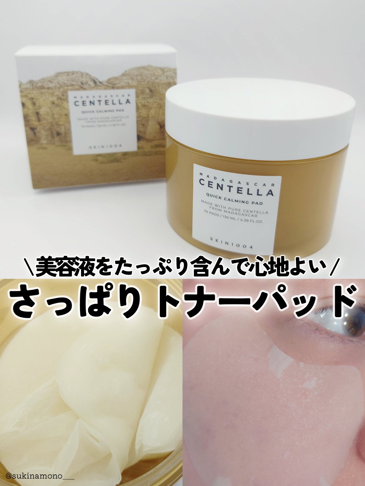 以前から好きで愛用していたSKIN1004のセンテラ クイックカーミングパッド🤎 7cmの大きなパッドなので、入れ物も結構大きめで重量感があります。 すごくスルスル滑らかな素材なので、拭き取りよりもコットンパックとして使うのが好きかも😋 水分感たっぷりのパッドで、パッドの窪みが目や鼻の周りに隙間なくぴったり密着♡