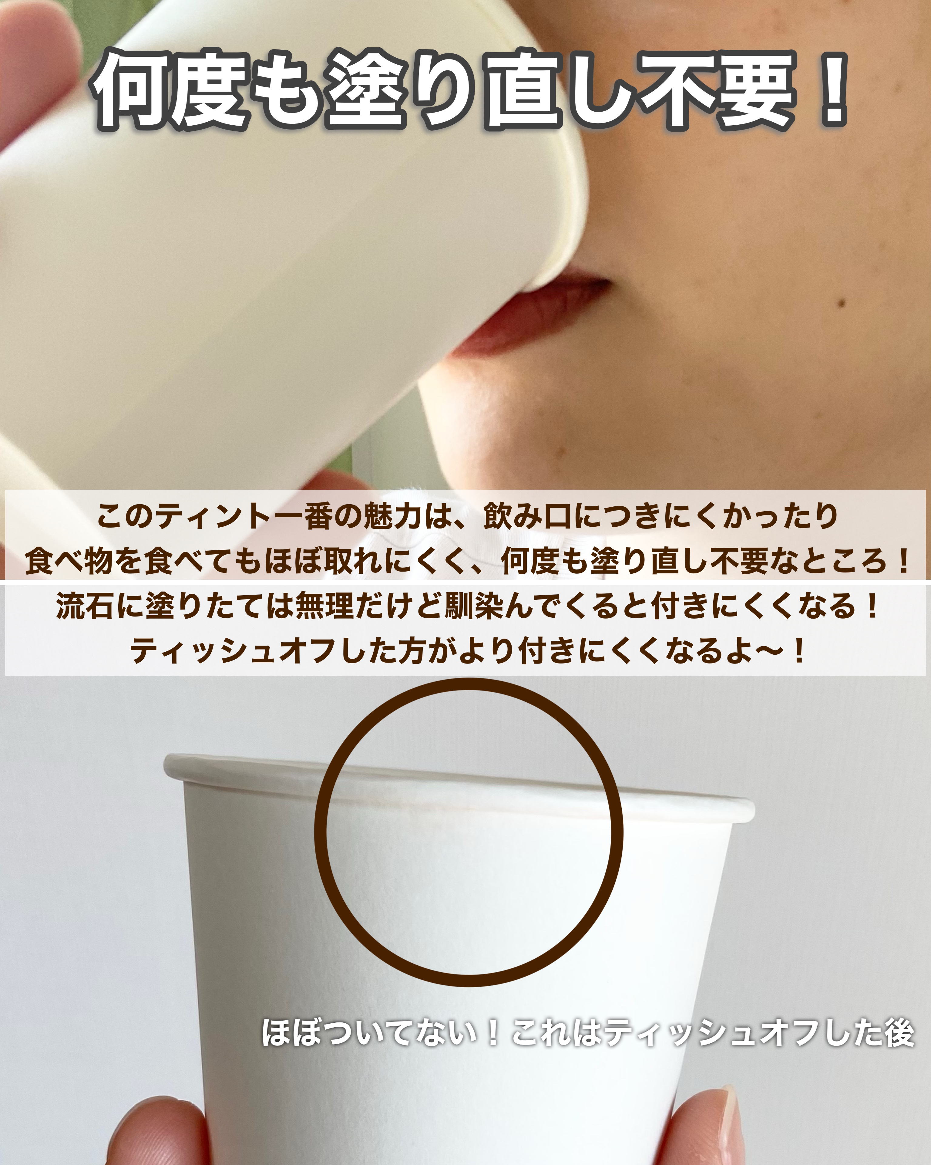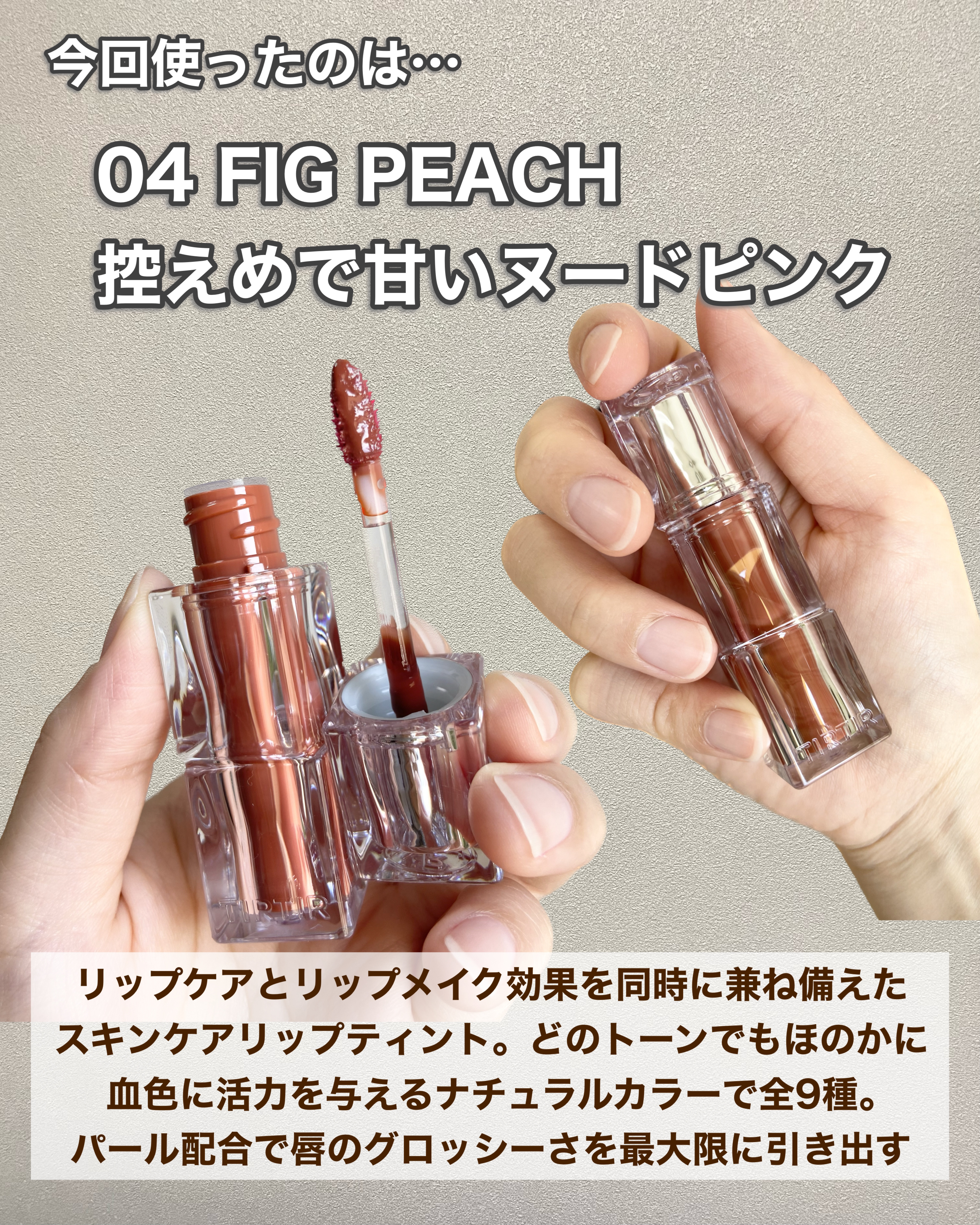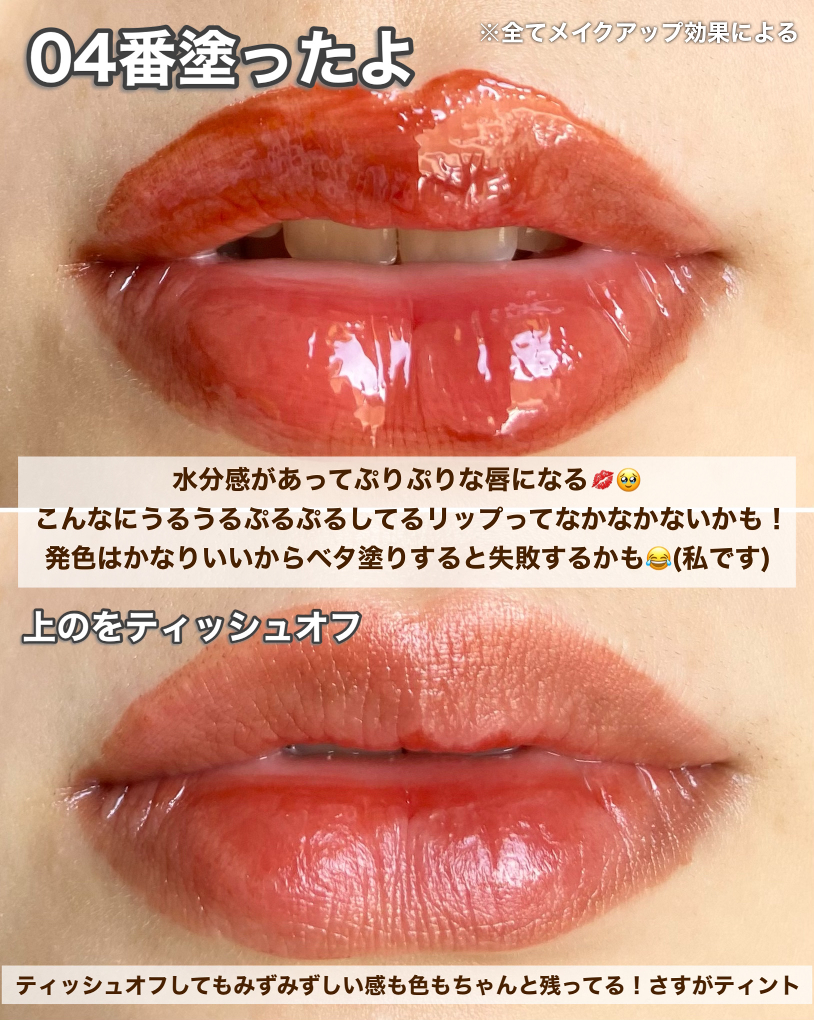 ティントは、透明感のある発色で、カラーとみずみずしい質感が持続してくれるティント!塗るときにムラになりにくいのも良かった💡 バームは、ナチュラルな発色で、ツヤっとした光沢感がきれい✨ 保湿感がほしいときに使うのがおすすめ!