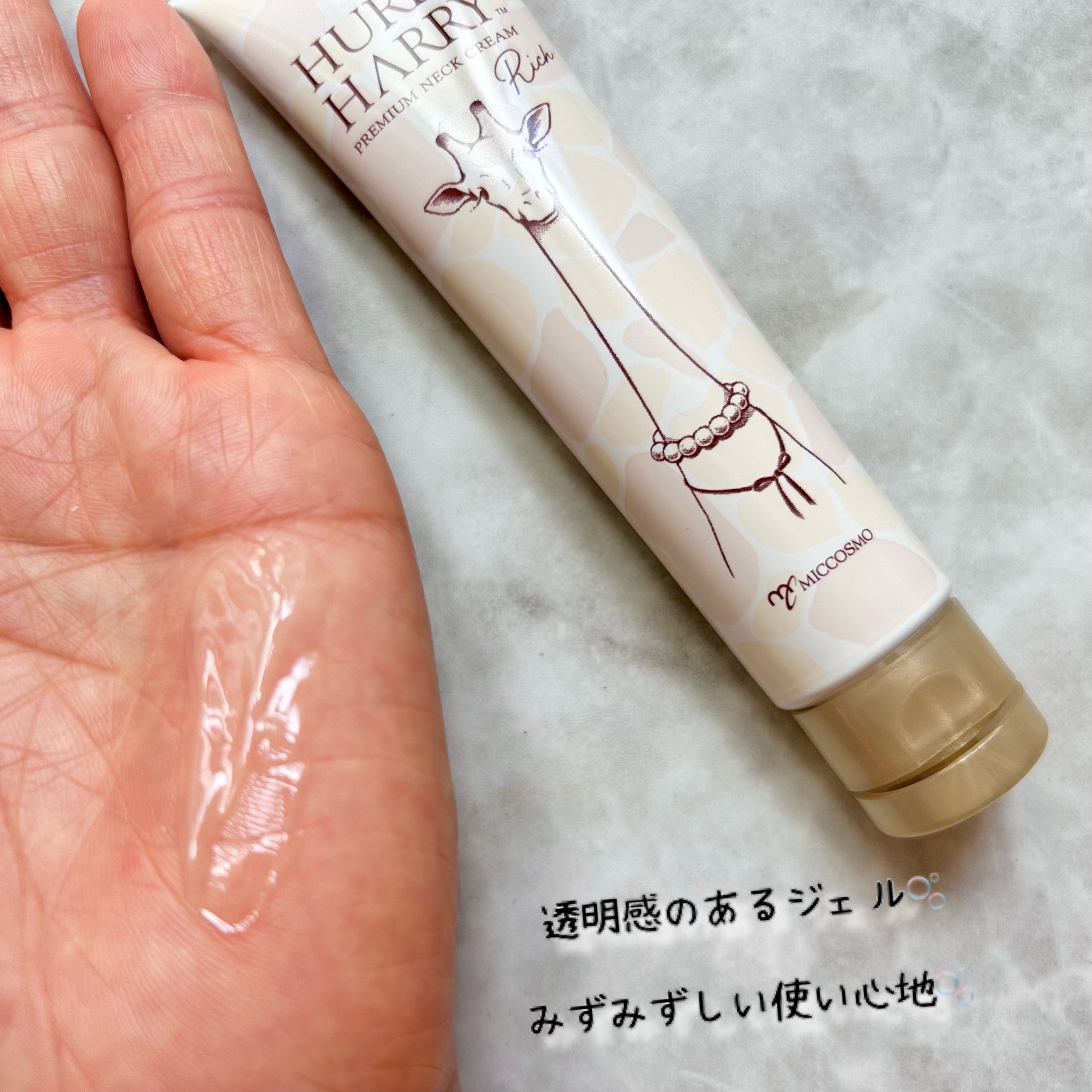 ハリーハリー薬用おとなの美くびクリームリッチアプリコットの香りのネッククリームです。みずみずしいテクスチャーのゲルクリームで、とても伸びが良くさらっとした使用感です。アプリコットの香りも気に入りました。ベタベタしないので朝も使いやすいです。キ...
