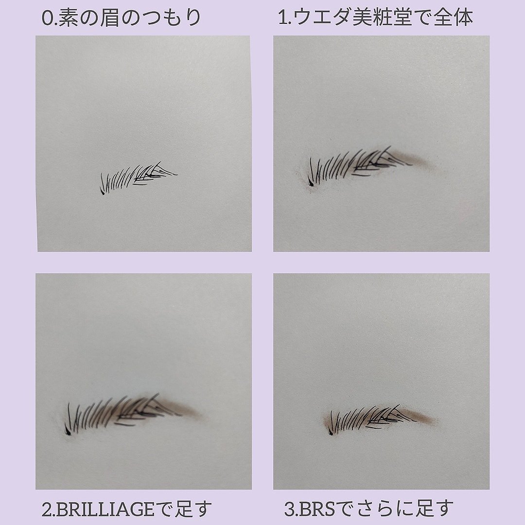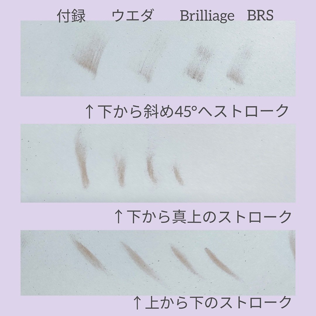 ウエダ美粧堂アイブローブラシ(アングル)を試しに買ってみたら信じられないくらい綺麗に描けて、ビックリ! このブラシは、毛質がバジャーなのと、もあってか、眉毛が歯抜けになっている箇所でも、ちゃんと色がのります。 BRILLIAGEアイブロウブラシで、眉尻や毛が歯抜けになっていた箇所を後追いすると、さらに眉毛のクオリティがUP。