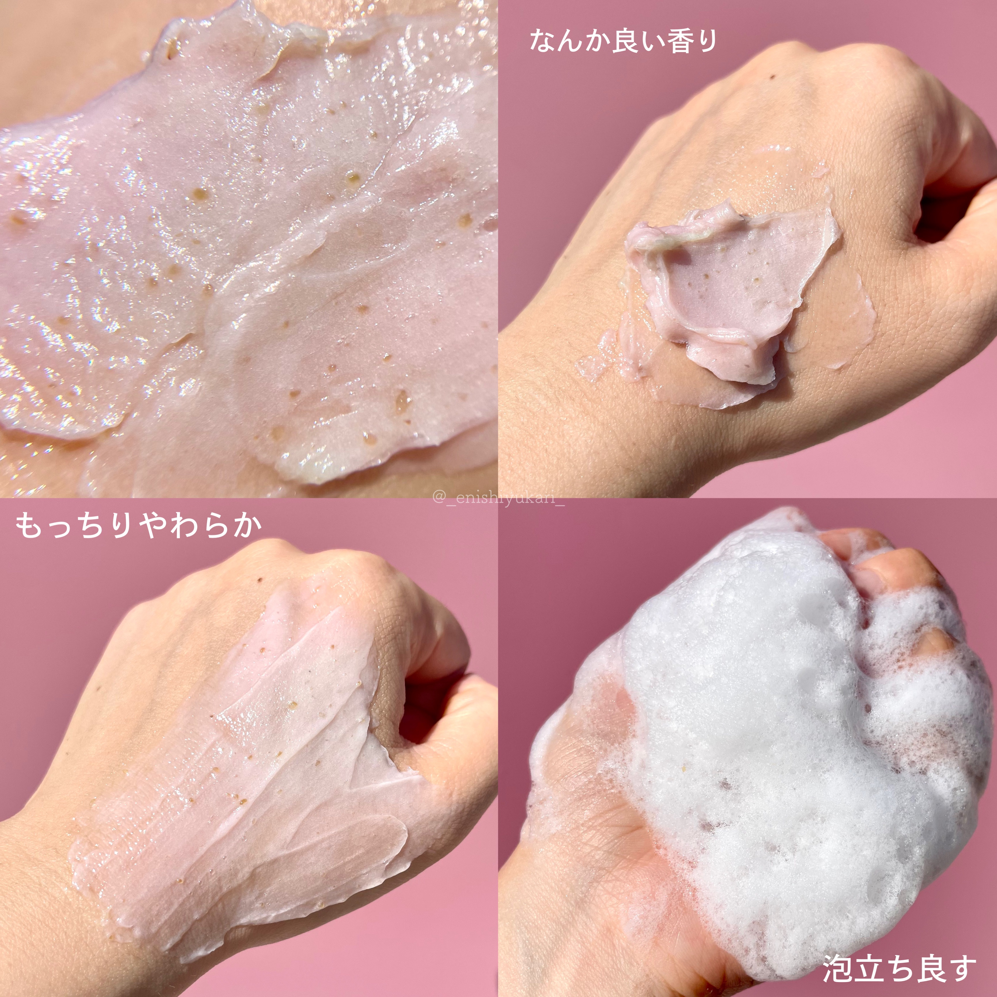 ピンクとアロエ色、またホイップしたような見た目がとっても可愛いです。 テクスチャーはふわふわしっとりなめらか。なめらかに伸びて、優しくなじませることが出来ます。 肌が食べる新感覚メレンゲクレンザー! やわらかい濃度で埋め尽くし、毛穴の隙間まで完璧に皮脂・老廃物・黒ずみを吸着。 保湿成分と自然クーリンク成分で使用後の毛穴引き締めまで。