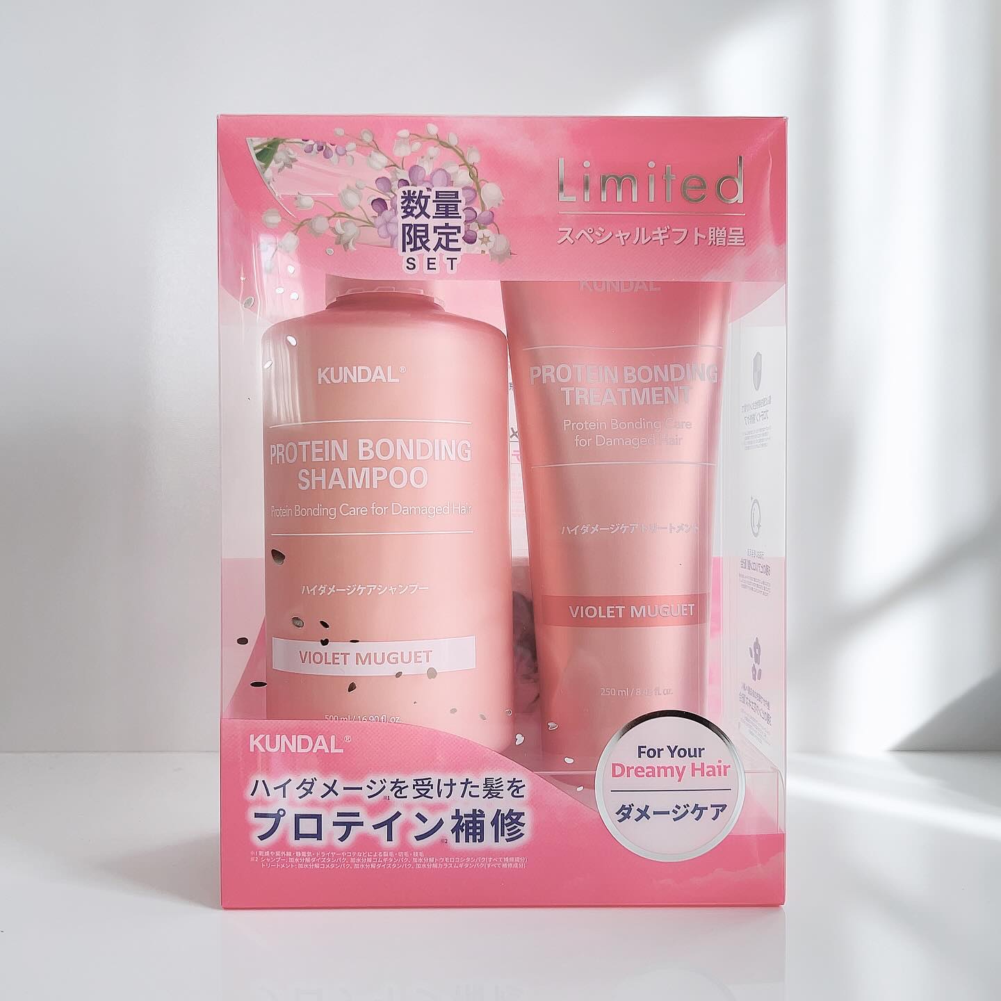 - 〈シャンプー〉 ・プロテイン*とヒアルロン酸*が、油分と水分をケアし髪をすこやかに保ちます。 ・センチフォリアバラ花エキス*、チューリップ花エキス*、ハイビスカス花エキス*でつややかに。 ・髪と頭皮のことを考えた弱酸性 ・VIOLET MUGUETの香り 甘くやさしいすずらんをイメージした、清潔感のある香りです。 〈トリートメント〉 ・プロテイン*とヒアルロン酸*が、油分と水分をケアし髪をすこやかに保ちます。 ・バラエキス*、チューリップ花エキス*、ハイビスカス花エキス*でつややかに。 ・クリームタイプのテクスチャーが傷んだ髪になじみます。 ・VIOLET MUGUETの香り 甘くやさしいすずらんをイメージした、清潔感のある香りです。 *保湿成分 ※セット品(シャンプー500ml+トリートメント250ml)を2023年11月20日より限定発売開始。