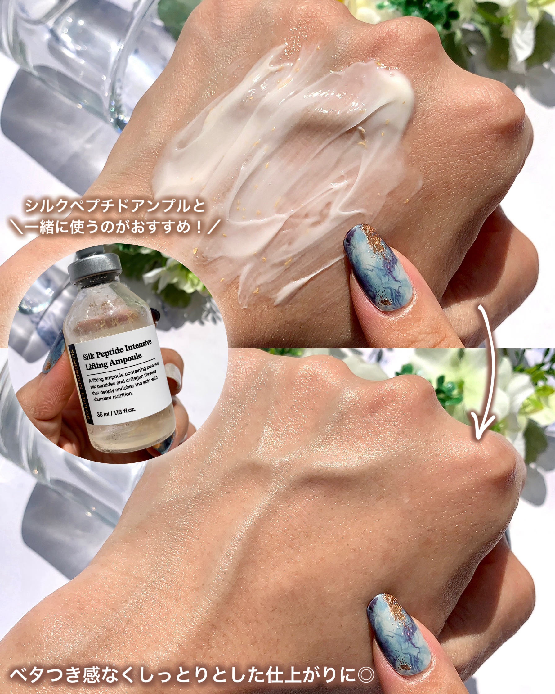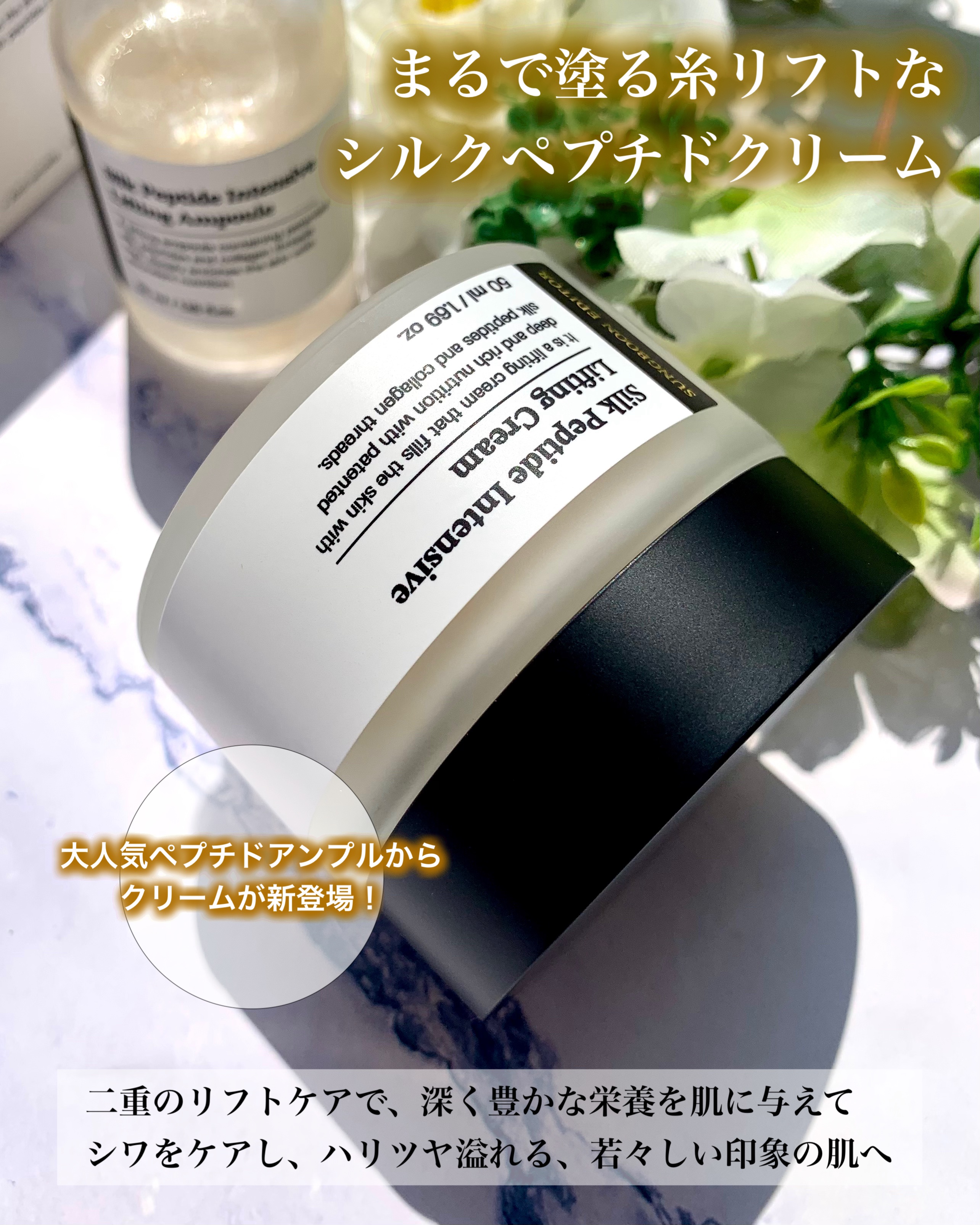 人気のペプチドアンプルからクリームが新登場SUNGBOONEDITORシルクペプチドインテンシブリフティングクリーム「塗る糸リフト」と呼ばれるゴールドの糸が入っていてこっくりしたテクスチャーのクリーム✨粘度があるねっちりながら伸びが良くて...