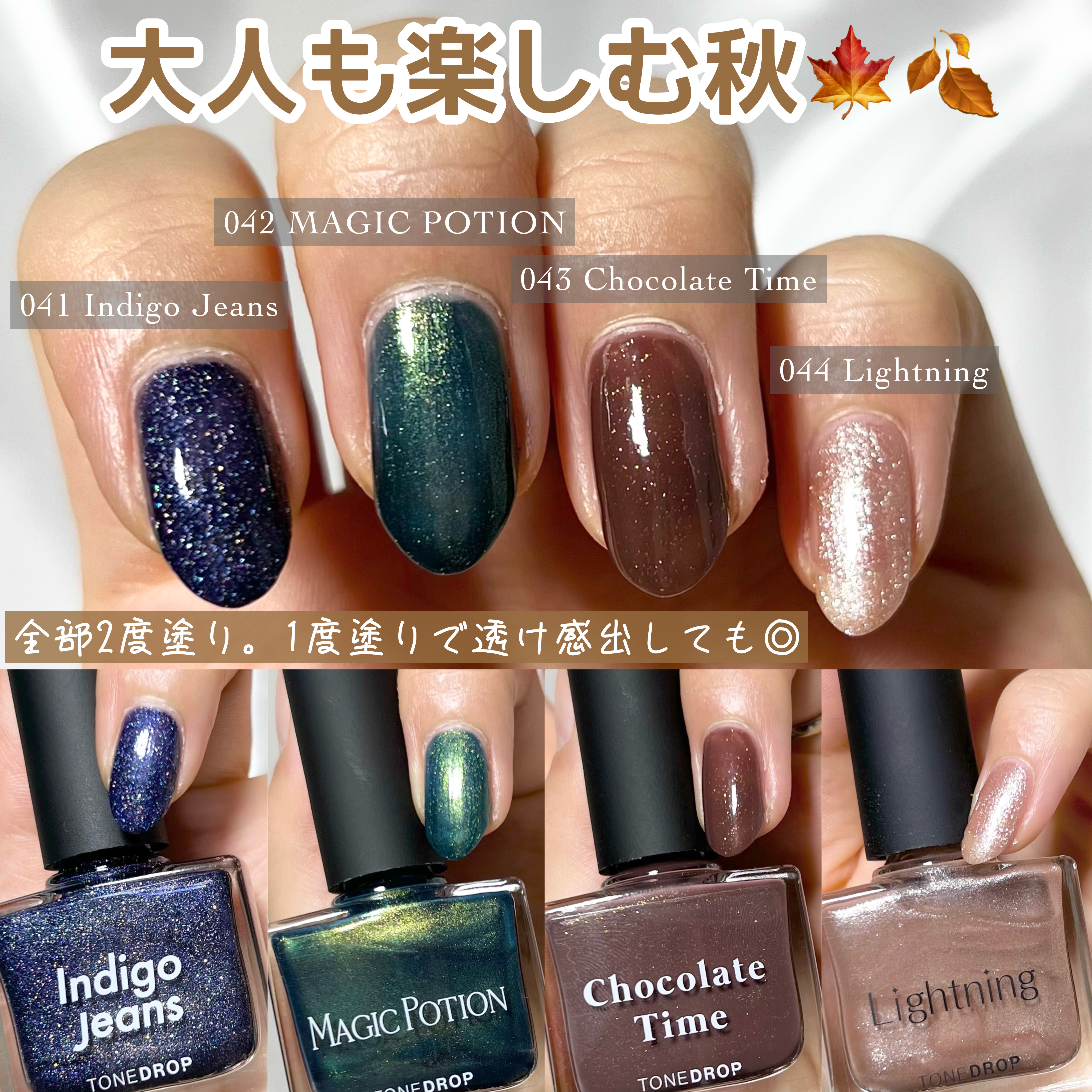 シックな秋色新色たちがとっても素敵🫶✨ 見てこのおしゃれな秋っぽカラー!深い秋色にたっぷり色んなラメ 041 Indigo Jeans 深いインディゴカラーに宇宙みたいなラメ シルバーラメや虹色偏光ラメたっぷりで立体感も 個人的にはIndigo Jeansの虹ラメがたっぷりキラキラで刺さりまくった…!! 単色塗りで様になるおしゃれカラー🌈🙌