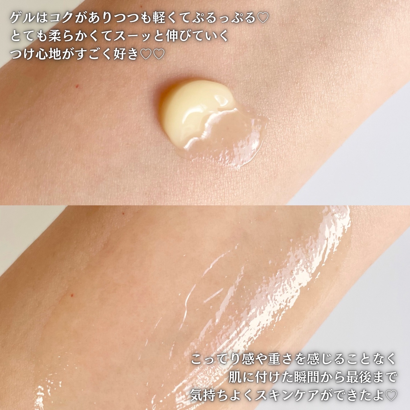 | 白さのあるぷるんとしたテクスチャーのゲル。 すっーとみずみずしく伸び、まろやかクリーミーなつけ心地。 | 詳細を見る | ||