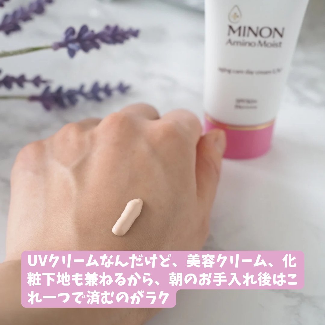 - 【シワ改善もできるUVクリーム】 SPF50+PA++++ シワ改善×UVカットが出来る薬用シワ改善UVクリーム。これ1本で美容クリーム・UVカット・化粧下地の3役。 シワ改善&しみ*予防成分「ナイアシンアミド」、肌あれ予防成分「グリチルリチン酸2K」配合。紫外線吸収剤&酸化亜鉛フリーで敏感肌を考えた処方。自然な輝きを放つ、やわらかなテクスチャーの化粧下地、見る角度で反射色が変わる「艶肌ダブルカラーパウダー」配合で自然な立体感を演出。 エイジングケア:年齢に応じたお手入れケア *メラニンの生成を抑え、しみ・そばかすを防ぐ (販売名:ミノンアミノモイストAU)【医薬部外品】