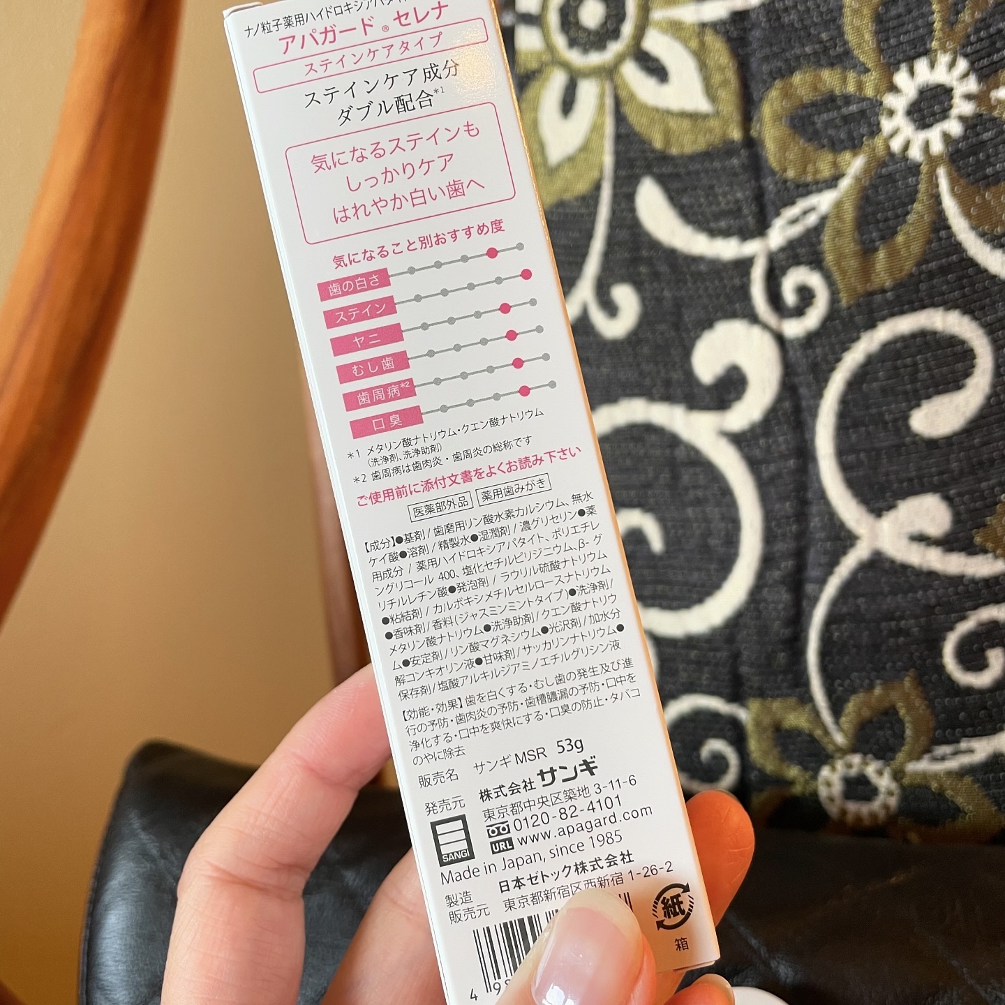 - 【医薬部外品】 美白歯みがき「アパガード」シリーズのステインケアタイプ。サンギ開発のむし歯予防成分「薬用ハイドロキシアパタイト」を配合。歯とほぼ同じ成分(歯のエナメル質の97%はハイドロキシアパタイト)で、エナメル質にアプローチ! さらにステインケア成分をダブル配合*し、コーヒーや紅茶・ワインなどの気になる着色汚れを落とします。 ステインケアではれやか白い歯に。 *メタリン酸ナトリウム(洗浄剤)・クエン酸ナトリウム(洗浄助剤) ●医薬部外品/薬用歯みがき 販売名:サンギMSR