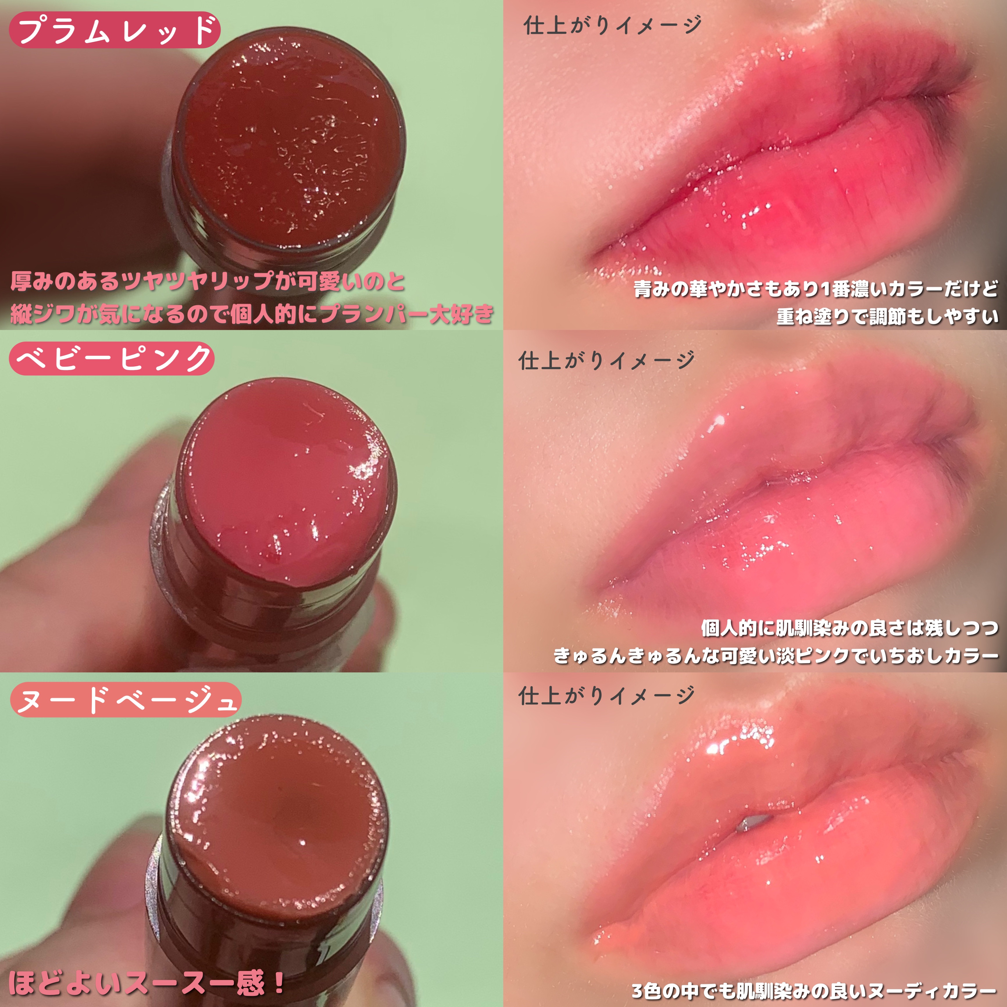 とにかくみずみずしい塗り心地 軽い着け心地 水ツヤ感がグロスとはひと味違った魅力! カラバリも水ツヤ感も大好きで 私もマスクメイクの日はもちろんいつものお出かけにも重宝してる🥺 テクスチャーともけもけチップと相まって するする乗るのがとても心地よくて いつも使うリップと正反対だったけれどたくさん使うようになった! 素の唇を美しく存在感を見いだすようなラインナップとして 肌馴染みの良いローズなどだけではなくて どきっとするようなエッジィなカラーに 遊び心のある洒落たカラーまで揃っていて たくさん集めたくなる🫠