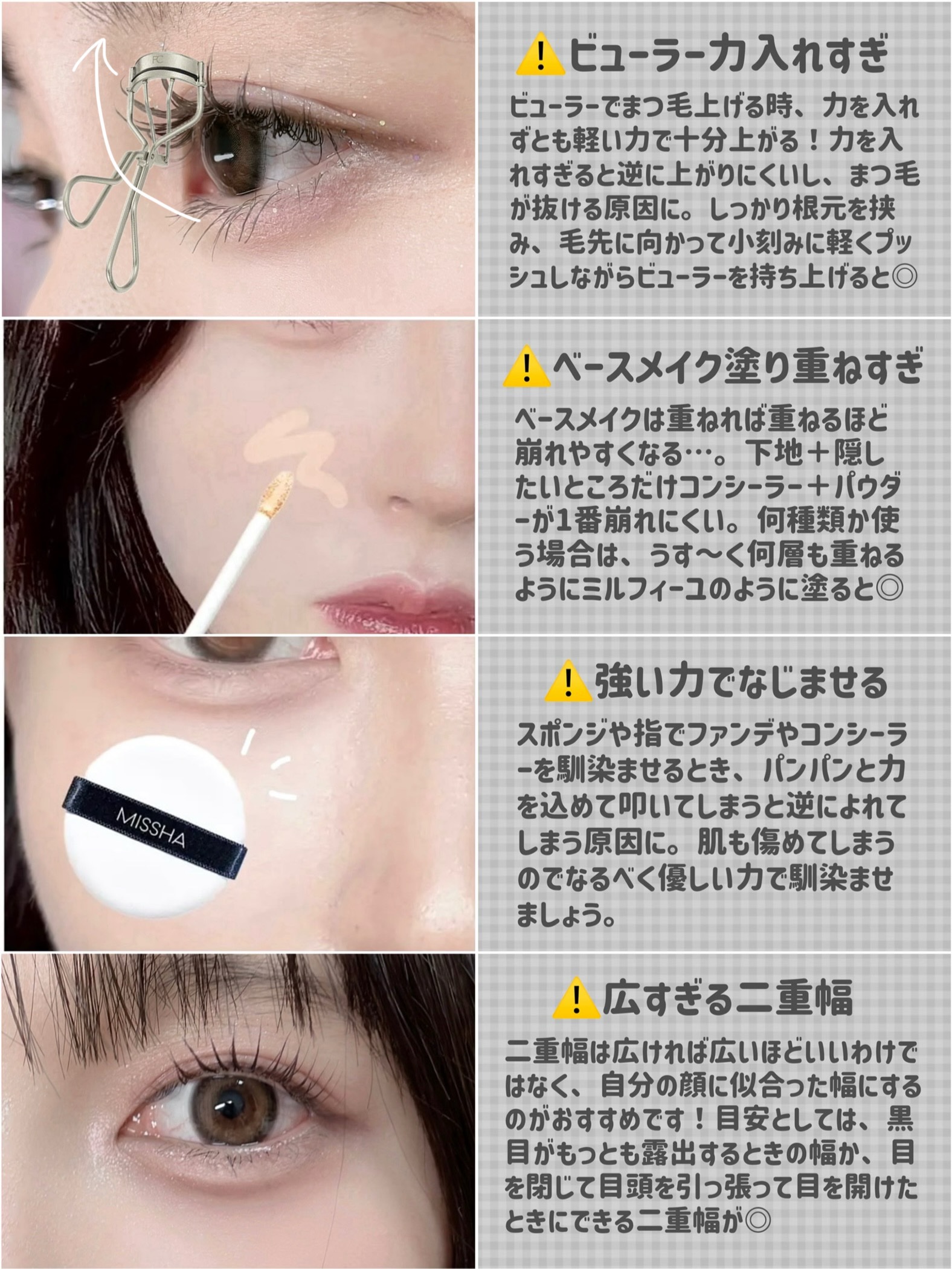 ベースメイクの順番はファンデーションの種類によっても違うのですが、 アイメイクはアイシャドウ→ビューラー→アイライン→マスカラという順番で行います。 アイメイクとのバランスを考えながら、どのリップを塗るかを決めます。 パウダーチークとクリームチークがありますが、クリームチークはムラになりやすいので初心者さんはパウダーがいいかも🙆♀️ ベースメイクの最後でもOKですが、全体のバランスを見ながら入れることでシェーディングが濃くなりすぎたりハイライトを付けすぎるなどの失敗が少なくなります。