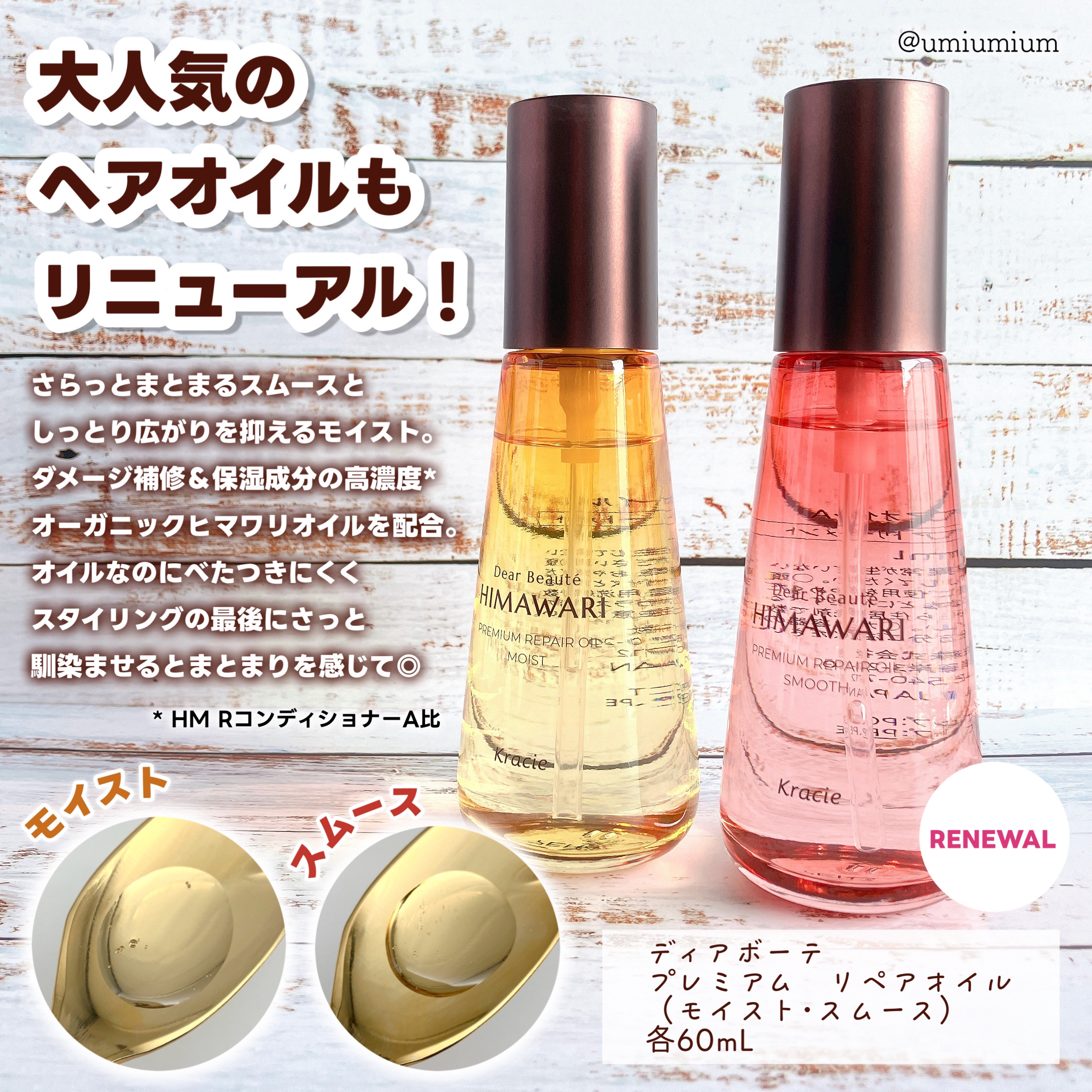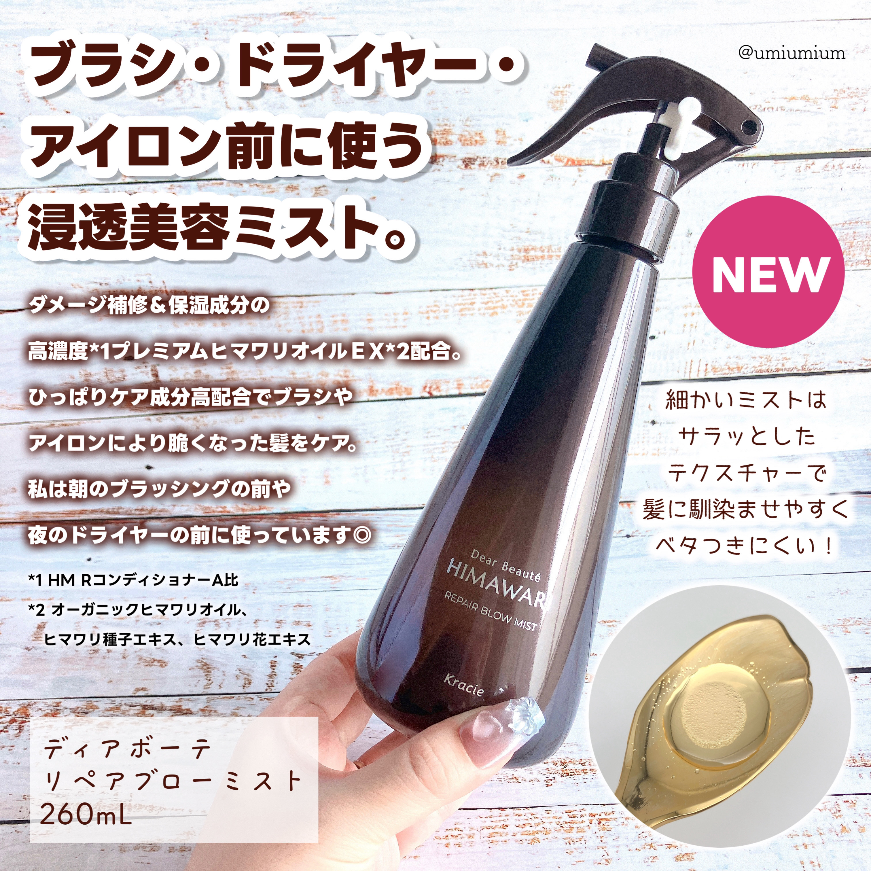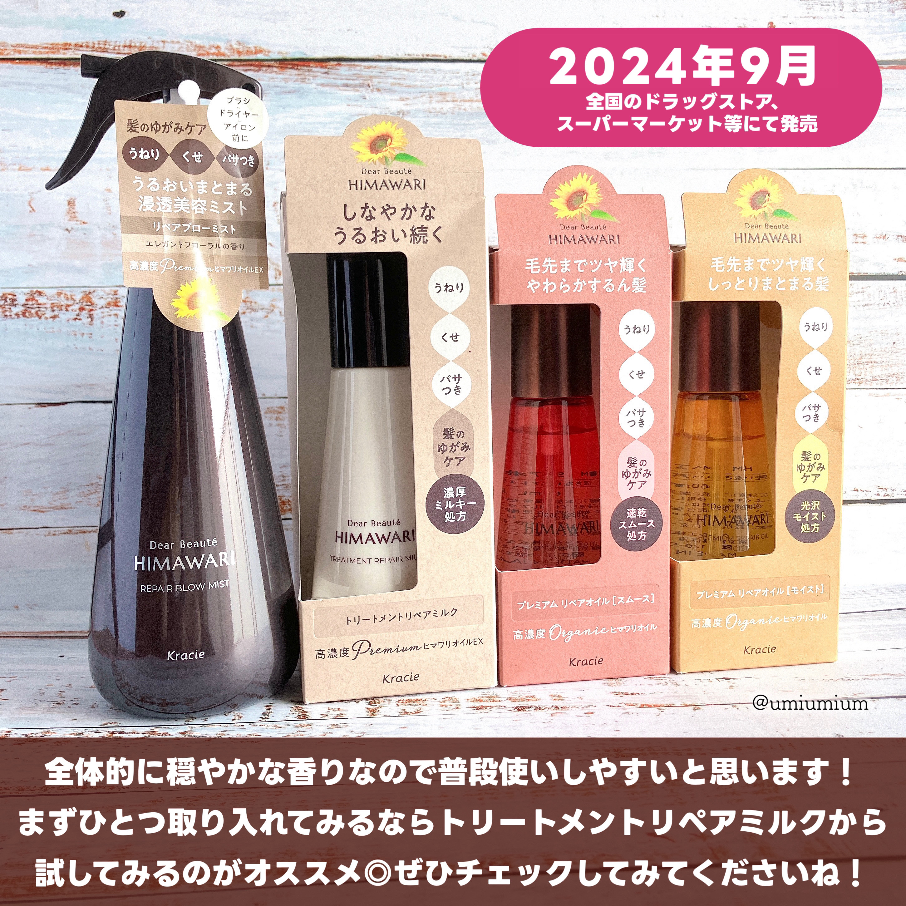 うねりやくせ、パサつきが気になる人におすすめで華やかなフローラルの香りがたまらなく好き💐 ミストやミルク、オイルなどを使い分けて自分の髪に合ったアイテムを選んでみてね🫧 ディアボーテ HIMAWARI*のリペアブローミスト、トリートメントリペアミルク、プレミアムリペアオイル(スムース)、プレミアムリペアオイル(モイスト)