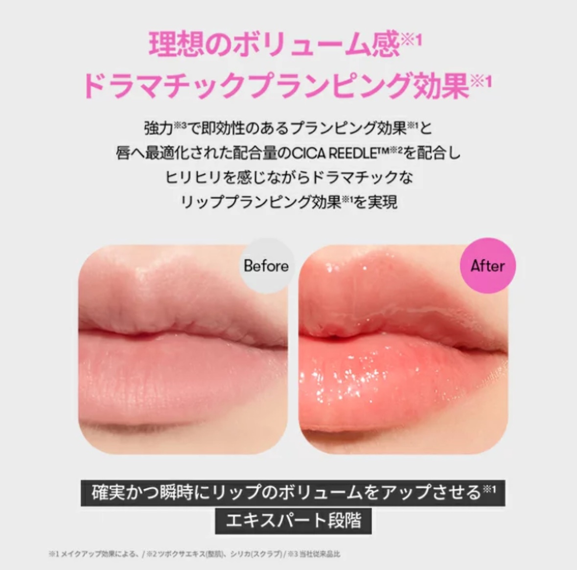 - VTの独自成分CICA REEDLE™*1とうるおいでハリ感を与える成分のボルフィリン*2が魅力的な唇へ導きます。唇にボリューム*3と光沢感を与え、乾燥が気になる唇をうるツヤ唇に導きます。リッププランパー初心者でも使えるビギナーから、ヒリヒリ感を感じながらよりボリューム効果*3を叶えたいエキスパートまで、自分の求める唇に合わせてチョイスできるのも魅力ポイント! *1 ツボクサエキス(整肌)、シリカ(スクラブ) *2 水添ポリイソブテン、ハナスゲ根エキス(いずれも保湿) *3 メイクアップ効果による