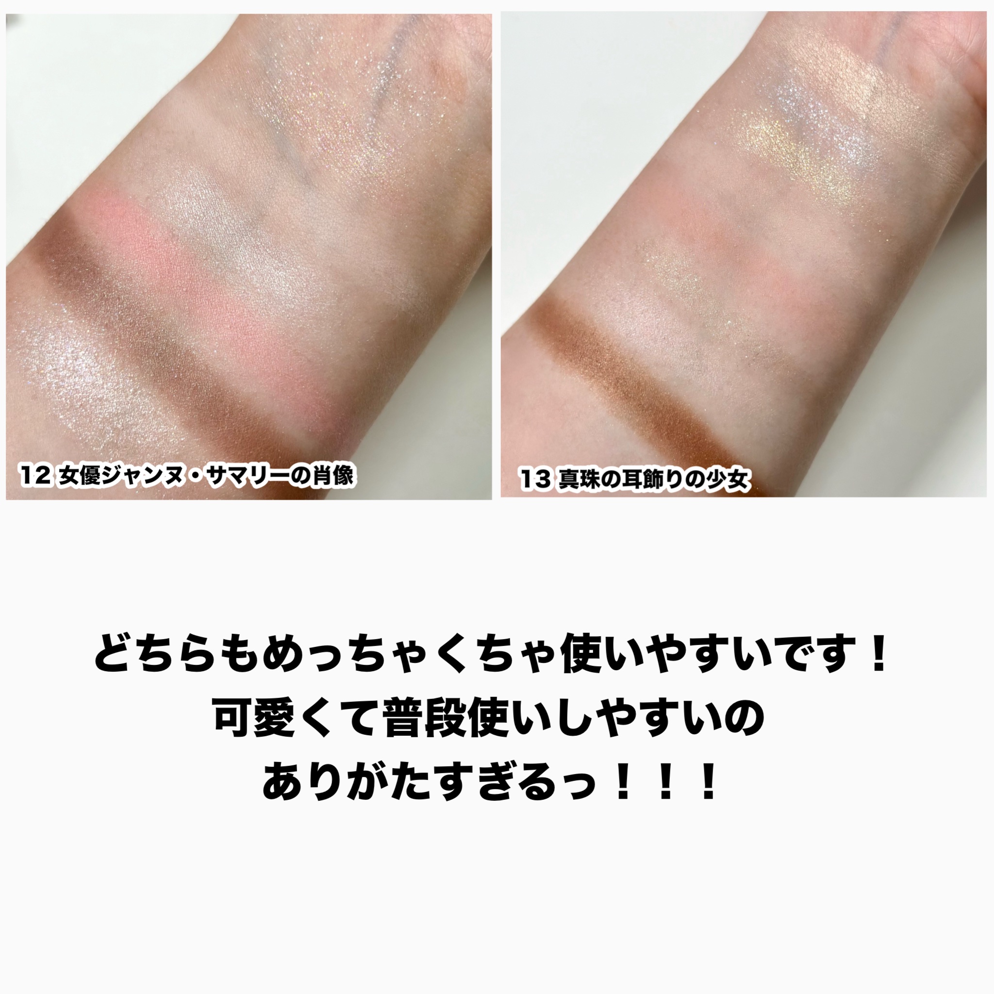 上品なローズカラーや、さまざまなトーンのピンクが目元に優雅なアクセントを加えます。 パケがとにかく美しくて可愛くて😮💨 ブック型になっていて、中までもちろん可愛い💞 ムラになりにくいさらさらな粉質も最高!