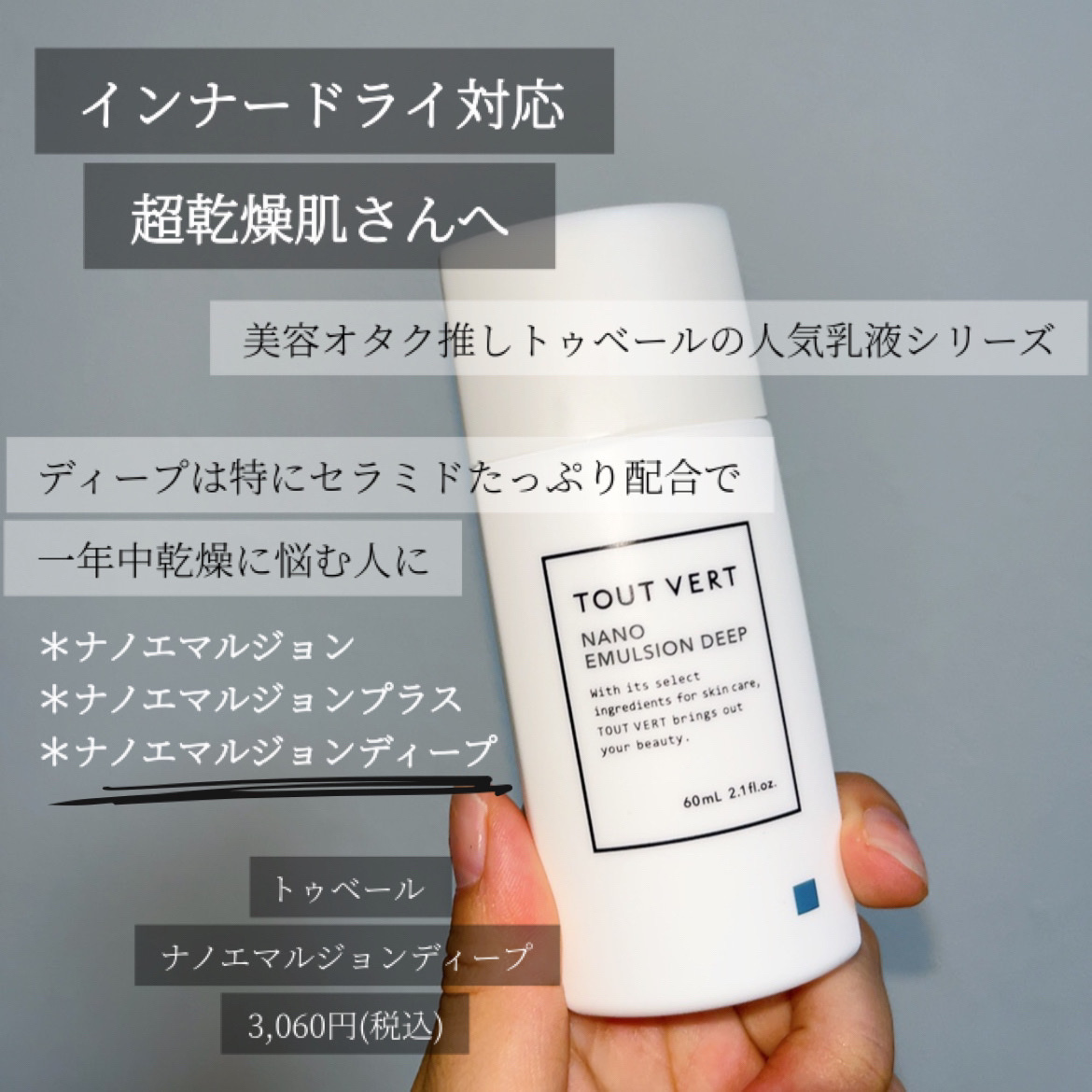 ■TOUTVERT■ナノエマルジョンディープ(60ml)¥3,060(税込)・さらっとしたテクスチャーが特徴で、ナノサイズの粒子が素早く浸透するインナードライ対策の乳液です。・セラミド類似成分(★1)12%+5種のヒト型セラミド(★2)・セラ...