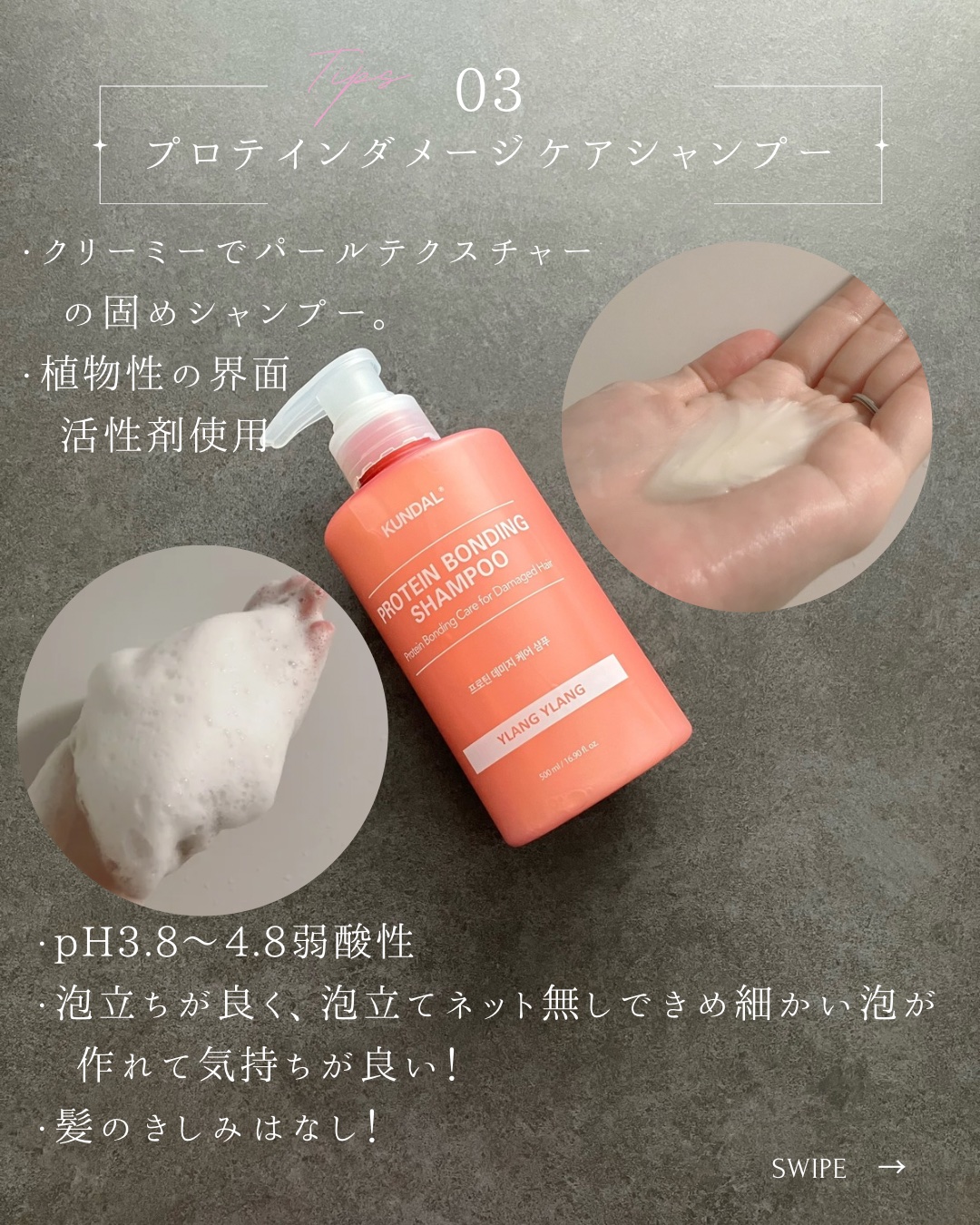 ダメージを受けた髪にタンパク質を! ダブルケアボンディングテクノロジーでツヤツヤでなめらかな髪に😌 2週間使用でキューティクルの粗さ37.63%改善⤴️ 1回の使用で毛髪タンパク質の結合力217.57%改善⤴️ 植物由来のタンパク質とオイルを同時にブレンドして、毛先までなめらかな髪へ🌼
