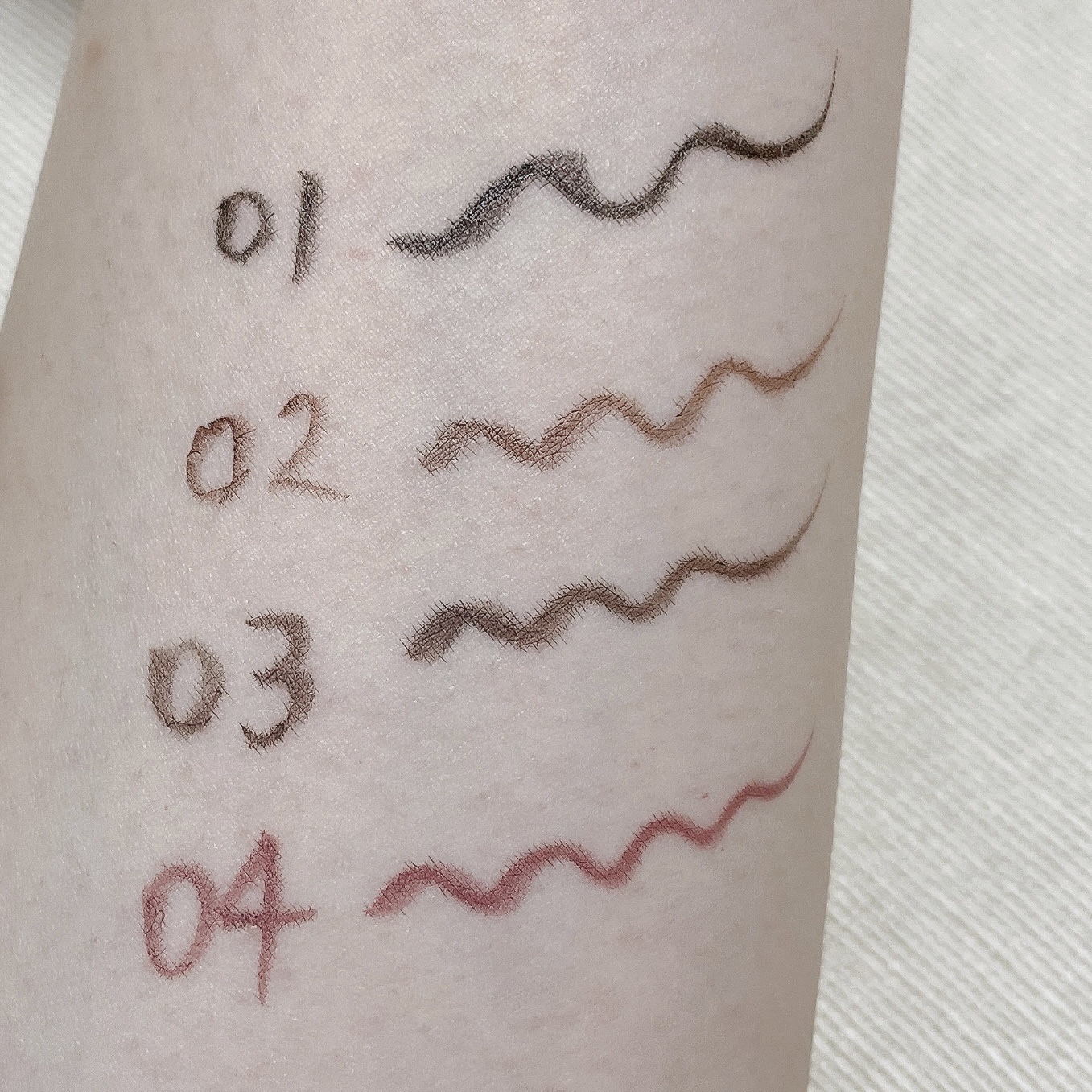 - <01 ブラック> 水、アクリレーツコポリマー、BG、1,2-ヘキサンジオール、(アクリレーツ/オクチルアクリルアミド)コポリマー、フェノキシエタノール、TEA、メチルパラベン、エチルヘキシルグリセリン、エチルパラベン、カミツレ花エキス、サトザクラ花エキス、アスコルビン酸、リンゴ酸、チャ葉エキス、カーボンブラック <02 ブラウン> 水、BG、アクリレーツコポリマー、ポリアスパラギン酸Na、フェノキシエタノール、セテス-20、エチルヘキシルグリセリン、メチルパラベン、水酸化Al、エチルパラベン、EDTA-2Na、クエン酸、デヒドロ酢酸Na、カミツレ花エキス、サトザクラ花エキス、アスコルビン酸、リンゴ酸、チャ葉エキス、酸化鉄 <03 チャバグレージュ> 水、BG、(アクリル酸エチルヘキシル/メタクリル酸メチル)コポリマー、ポリアスパラギン酸Na、(アクリレーツ/メチルスチレン/スチレン)コポリマーアンモニウム、1,2-ヘキサンジオール、フェノキシエタノール、ベヘネス-30、メチルパラベン、エチルパラベン、セテス-20、EDTA-2Na、クエン酸、デヒドロ酢酸Na、カミツレ花エキス、サトザクラ花エキス、アスコルビン酸、リンゴ酸、チャ葉エキス、エチルヘキシルグリセリン、酸化チタン、酸化鉄、カーボンブラック、水酸化Al <04 スモーキーベリー> 水、BG、(アクリル酸エチルヘキシル/メタクリル酸メチル)コポリマー、1,2-ヘキサンジオール、ポリアスパラギン酸Na、(アクリレーツ/メチルスチレン/スチレン)コポリマーアンモニウム、フェノキシエタノール、セテス-20、メチルパラベン、エチルパラベン、ベヘネス-30、AMP、EDTA-2Na、デヒドロ酢酸Na、カミツレ花エキス、サトザクラ花エキス、アスコルビン酸、リンゴ酸、チャ葉エキス、エチルヘキシルグリセリン、酸化チタン、酸化鉄、赤226、カーボンブラック、水酸化Al