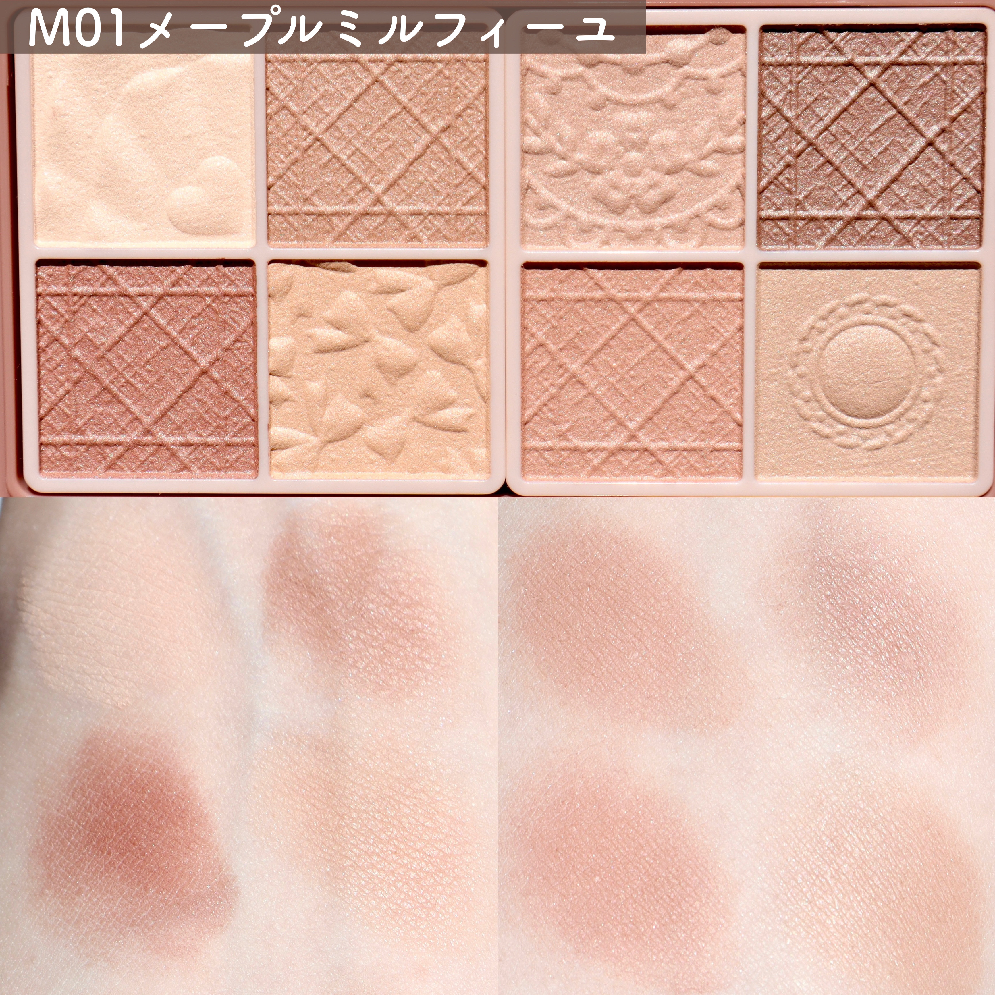 - <M01 メープルミルフィーユ> タルク、リンゴ酸ジイソステアリル、窒化ホウ素、スクワラン、トリエチルヘキサノイン、ジフェニルジメチコン、ヘキサ(ヒドロキシステアリン酸/ステアリン酸/ロジン酸)ジペンタエリスリチル、ラウリン酸亜鉛、メチルパラベン、ブチルパラベン、アルガニアスピノサ核油、トコフェロール、水、BG、ヒアルロン酸Na、センチフォリアバラ花エキス、カミツレ花エキス、シリカ、マイカ、酸化チタン、酸化鉄、水酸化Al <M02 ロマンティックフォグ> タルク、リンゴ酸ジイソステアリル、窒化ホウ素、スクワラン、トリエチルヘキサノイン、ジフェニルジメチコン、ラウリン酸ヘキシル、ジメチコン、ヘキサ(ヒドロキシステアリン酸/ステアリン酸/ロジン酸)ジペンタエリスリチル、ラウリン酸亜鉛、ポリブテン、ナイロン-12、メチルパラベン、ブチルパラベン、アルガニアスピノサ核油、トコフェロール、水、BG、ヒアルロン酸Na、センチフォリアバラ花エキス、カミツレ花エキス、グンジョウ、コンジョウ、シリカ、ホウケイ酸(Ca/Al)、マイカ、マンガンバイオレット、酸化スズ、酸化チタン、酸化鉄、水酸化Al、赤226、硫酸Ba <M03 ミルキーチェリコッタ> タルク、リンゴ酸ジイソステアリル、窒化ホウ素、スクワラン、トリエチルヘキサノイン、ジフェニルジメチコン、ラウリン酸ヘキシル、ジメチコン、ヘキサ(ヒドロキシステアリン酸/ステアリン酸/ロジン酸)ジペンタエリスリチル、ラウリン酸亜鉛、ポリブテン、ナイロン-12、メチルパラベン、ブチルパラベン、アルガニアスピノサ核油、トコフェロール、水、BG、ヒアルロン酸Na、センチフォリアバラ花エキス、カミツレ花エキス、グンジョウ、シリカ、ホウケイ酸(Ca/Al)、マイカ、酸化スズ、酸化チタン、酸化鉄、水酸化Al、赤226、硫酸Ba