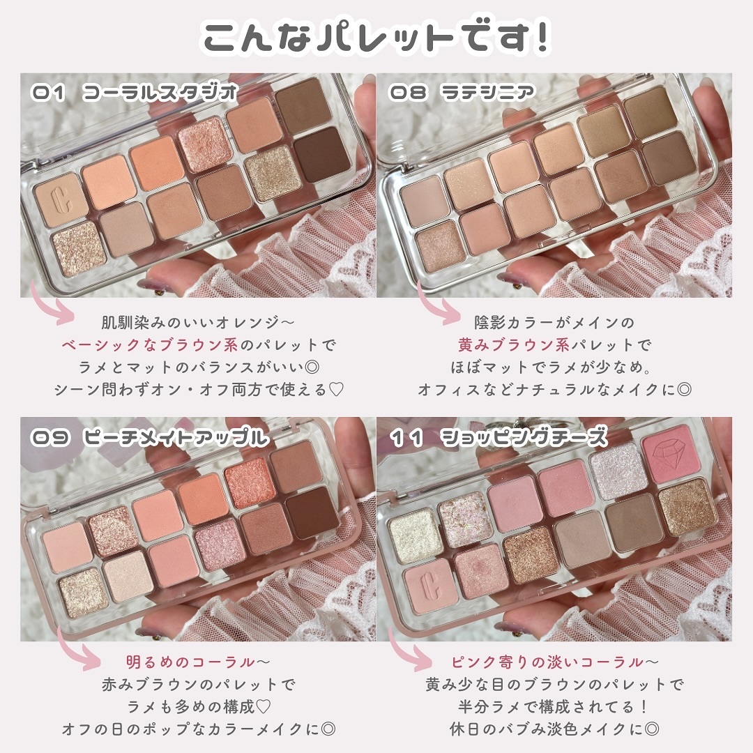 このパレット昨日テスターしてみたー! 「粉質が神」ってどうゆことやろーって思ってたけど、あー、こういうことかっ🤦🏻♀️🎀って思った笑💗 ほしい色味は09と11かな🙌🏻💭