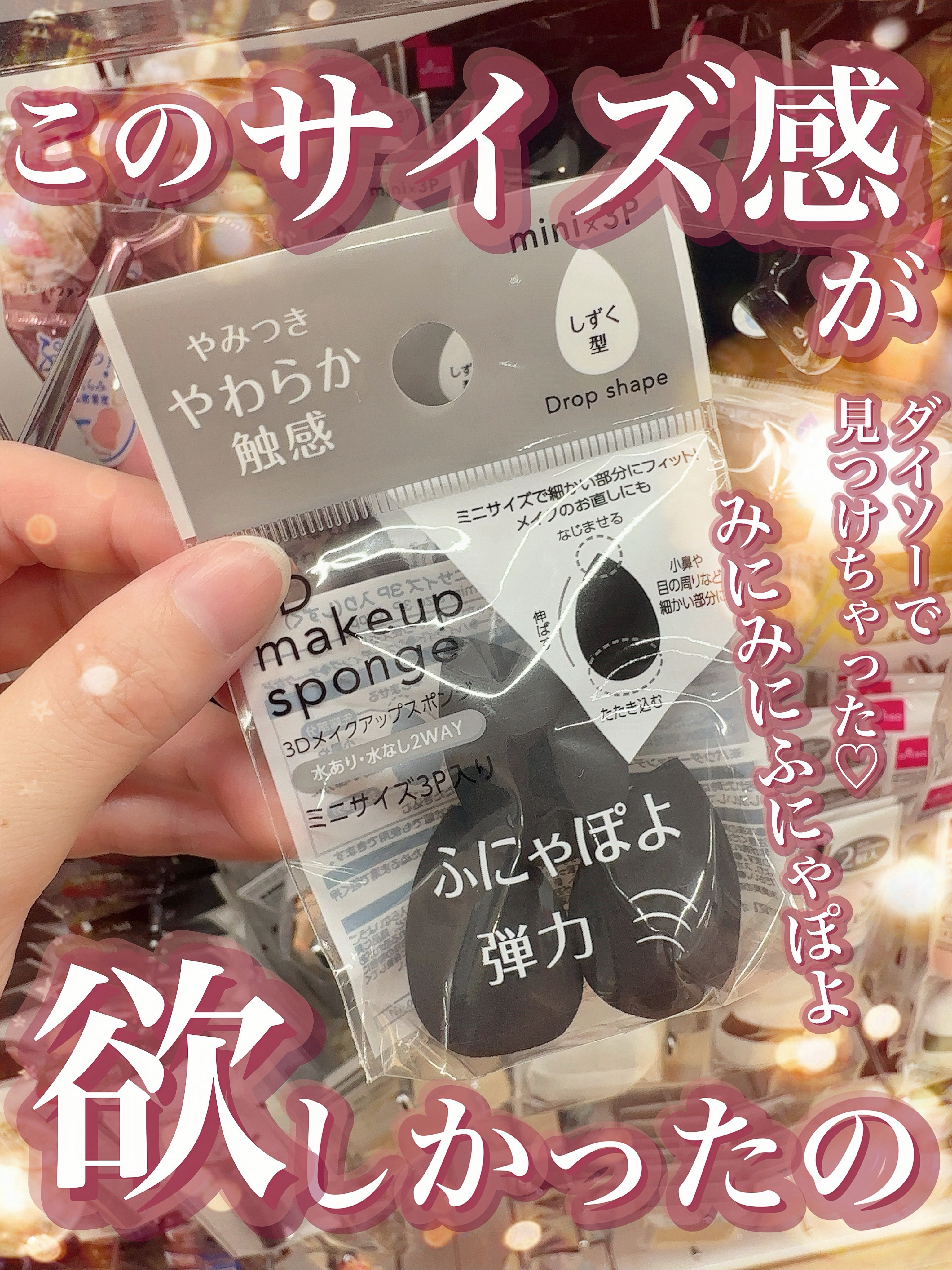 ミニサイズの3Dスポンジが3つ入っている商品で、めちゃくちゃお手頃! 触り心地は、めちゃくちゃ柔らかくてむちぷに!! 小さめサイズのスポンジだから、小鼻のキワだったり、目元のキワにも塗りやすい! チークの境界線をメインにポンポンすると、ツヤツヤのチークになるの💖 ツヤチークが好きな人には1回はやってみてほしい!!